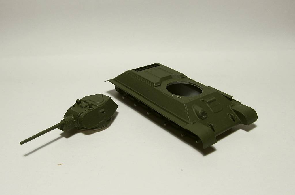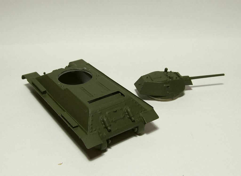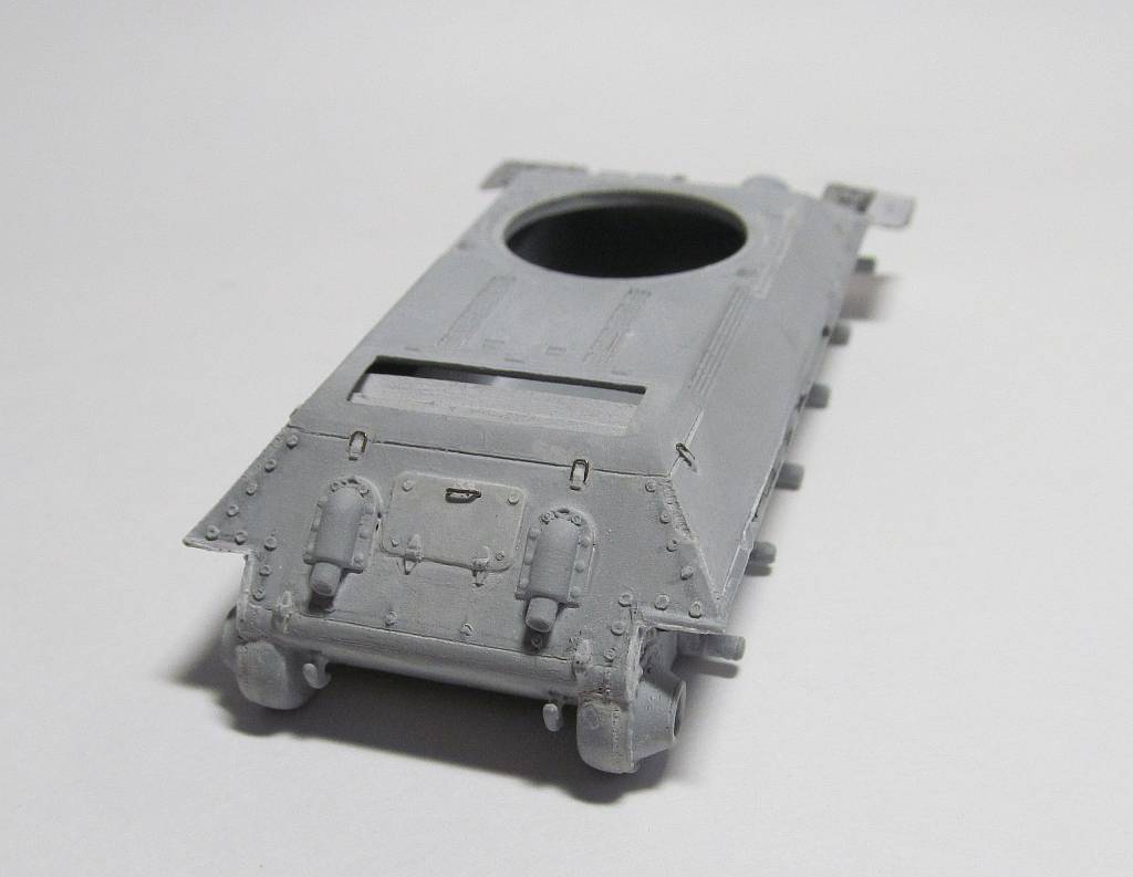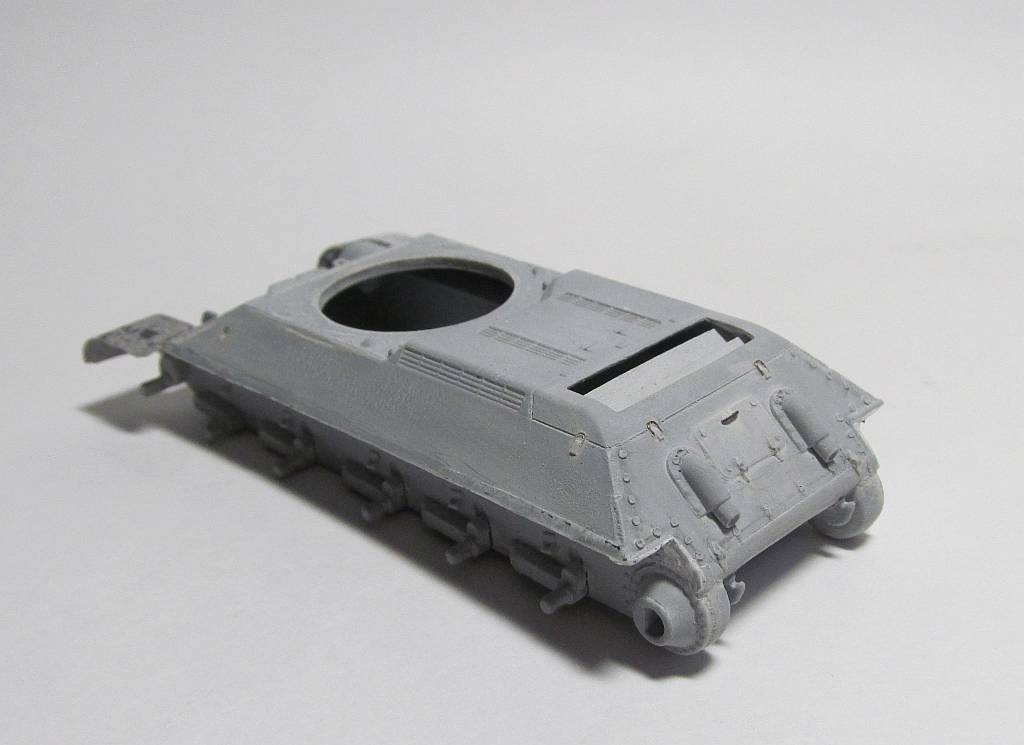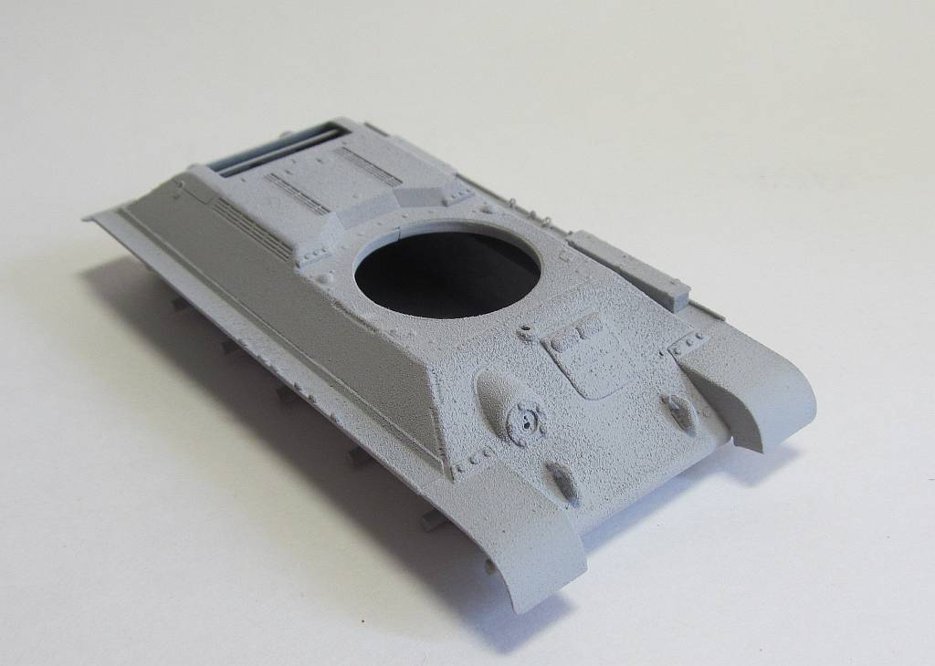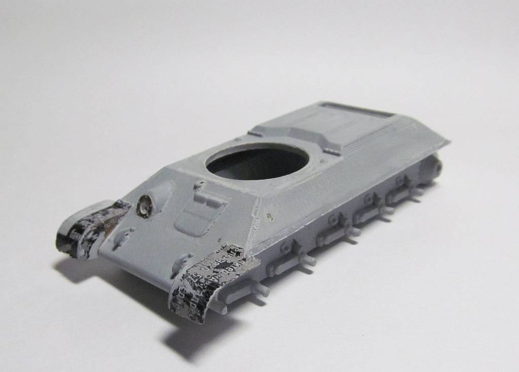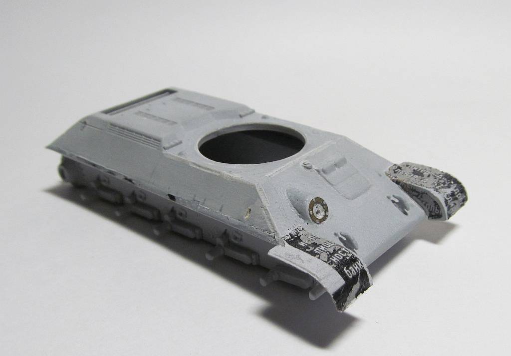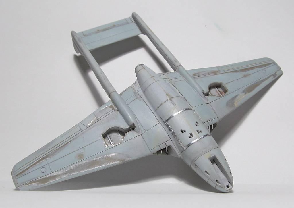 И снова здравствуйте, коллеги. После неудачи с удалением грунта, я уже на полном серьёзе собирался выбросить испорченный корпус, рука так и не поднялась. Пришлось воскрешать. Срезал с корпуса поеденные жидкостью для снятия лака болты, заново рассверлил отверстия и установил новые, мастерклабовские. Заново изготовил крылья и зашпаклевал посадочные места под антенный ввод и фару(старая шпаклёвка вывалилась от воздействия растворителя). На продолжение участия в ГБ я тогда уже не рассчитывал, поэтому фото процесса не делал, уж извините. Красить модель, на этот раз, решил кистью. Хотел, в порядке эксперимента, всё окрасить темперой, но после трёх-четырёх слоёв убедился, что ей не хватает укрывистости и вернулся к проверенному супер-акрилу звезды, который, впрочем, тоже пришлось наносить за несколько проходов. Такое количество слоёв краски, естественно не пошло на пользу и без того попорченному растворителем мелкому рельефу, так что результат меня не особо радует, но деваться некуда, буду доделывать уже из чистого упрямства. На данный момент всё это выглядит примерно вот так: