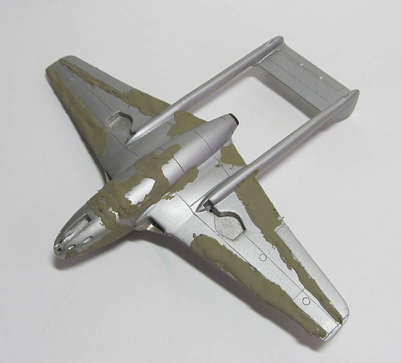 Давеча сподобился приступить к окраске. Воспользовался свой любимой сцеженной из баллона серебрянкой, которая на самом деле грунтовка по пластику, купленная в магазине автокрасок. После окраски неожиданно проявилась почти вся старая расшивка, которую я так долго и, вроде бы, тщательно шпаклевал и вышкуривал. Что теперь с этим теперь делать - непонятно. Заново вышкуривать в двух шагах от финиша настроения никакого нет. Есть мысль расписать его чёрно-жёлтыми полосами как у коллеги Phantom1976, чтобы эти мелкие канавки потерялись на пёстром фоне, но хотелось бы немного подробностей, что это вообще за "большой полосатый мух".