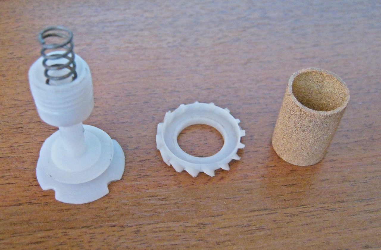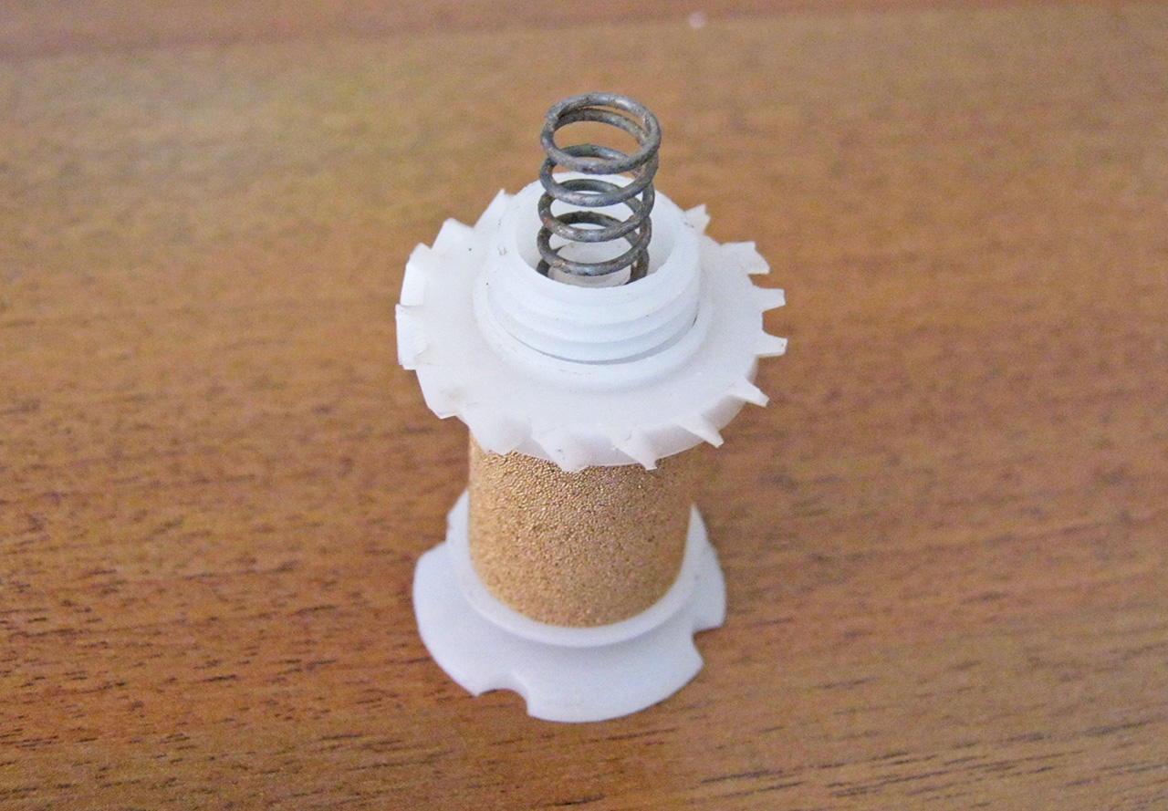 Да там всего 4 детали внутри - две пластмасски, пружина и фильтр. Одна из пластмассовых деталей выглядит как кольцо с лепестками, вот если оно неплотно прилегает, вполне может воздух пролетать в шланг напрямую.