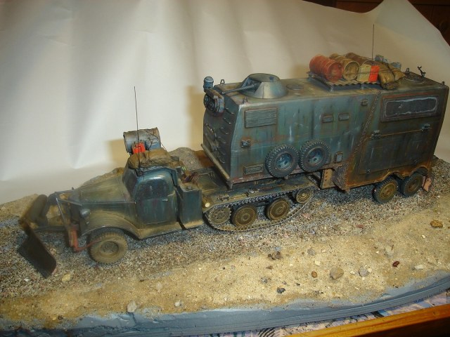Складывается впечатление, то забыли покрасить рамки боковых стекло, залитое клеем лобовое стекло надо замаскировать. сделать трафарет по форме дворника из модельного молярного скотча и задуть светлой - песочной краской. Крыша коричневая. почему? если это брезент. то ее бы покрасить в цвет брезента. ящики под машиной коричневые то же не понял зачем, если ржавчина, то как - то странной смотрится на фоне обсолютно чистой машины.
