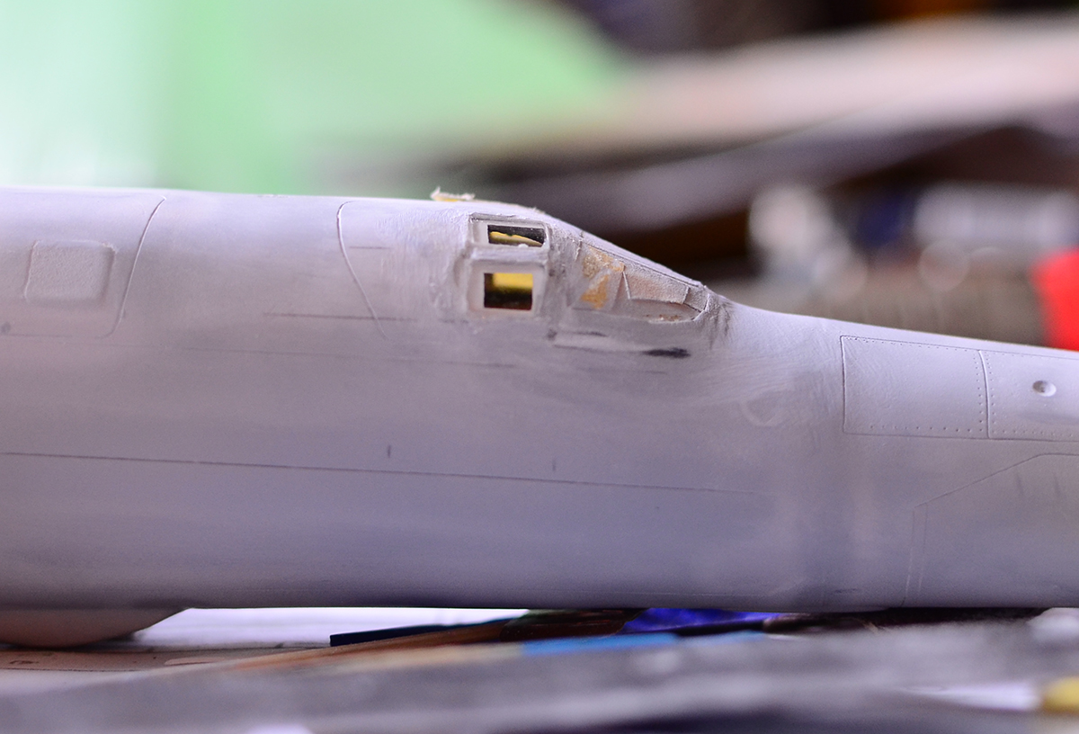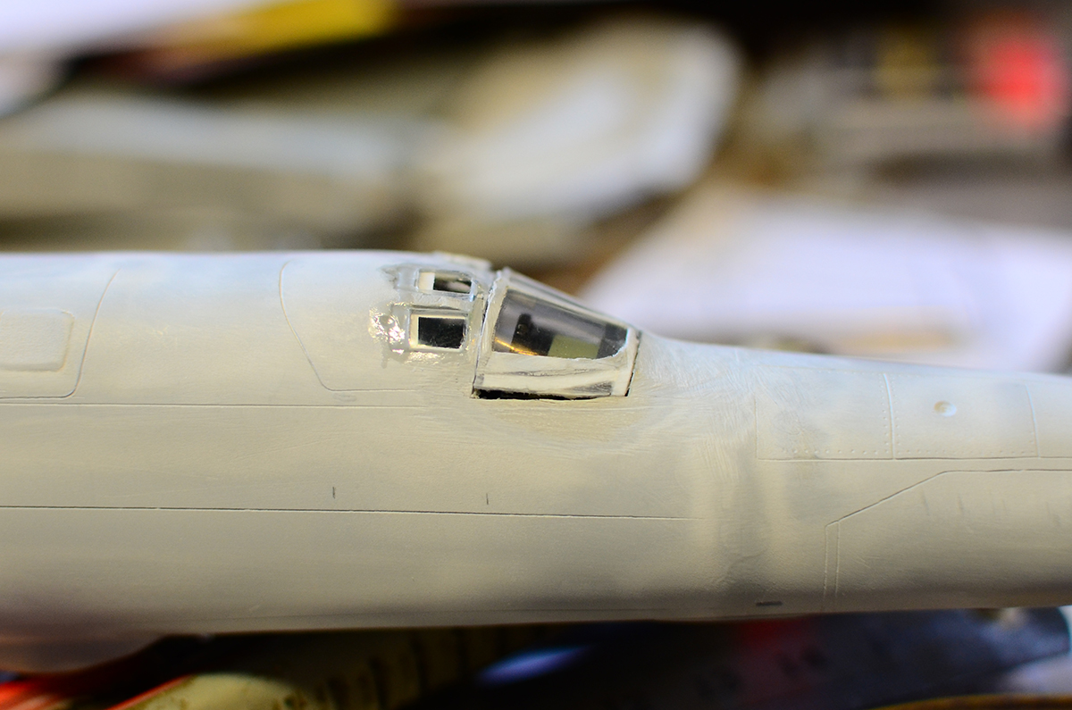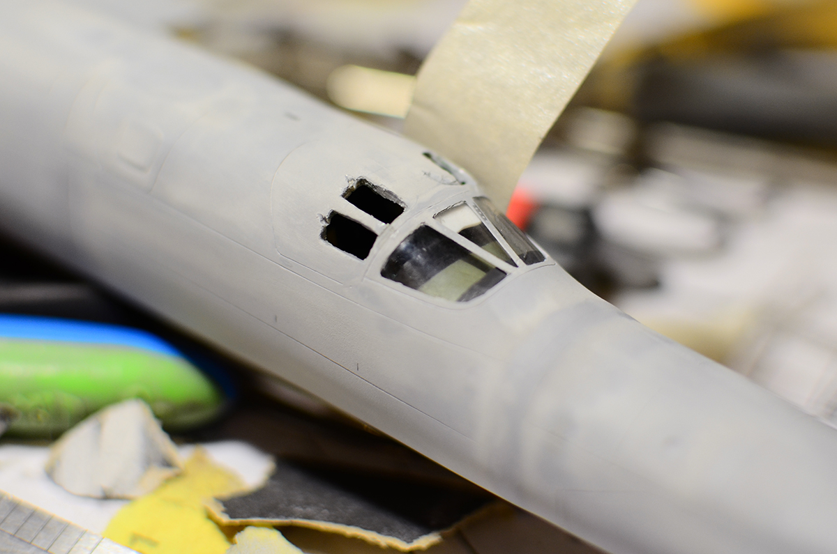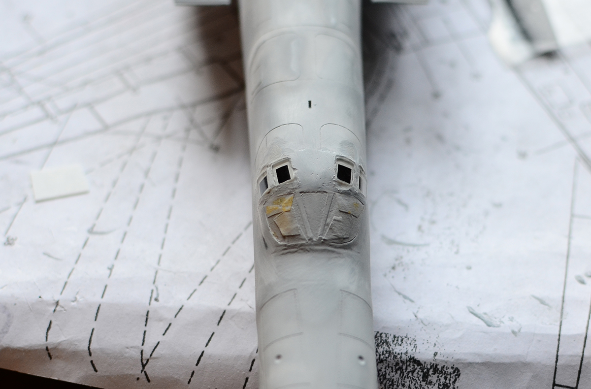 Взял я и приклеил носовую часть с ВЗ к фюзеляжу, где-то это затруднит стройку, но моральный подъем есть. Стройка идет по принципу 2 шага вперед- 1 назад. Очень многие места расшивки я залил грунтом и буду шкурить и резать заново, ибо не нравятся мне траншеи или ровность линии. Кстати по грунту хорошо режется крой. Самая западня- это значительный провал между крышками фонаря по левому боку, пришлось налить тонну грунта что бы поднять этот провал ну и залил линии расшивки, имитирующие крышку фонаря штурмана, что восстанавливать не очень легко, ибо они очень криволинейные. Тем не менее потиху нарезаю все больше кроя, восстанавливаю винты, т.е. процесс идет.
