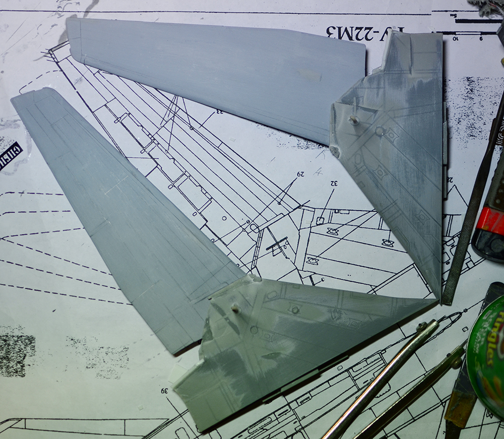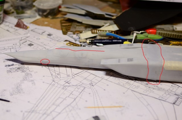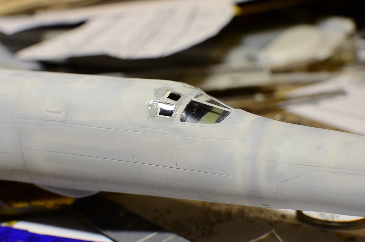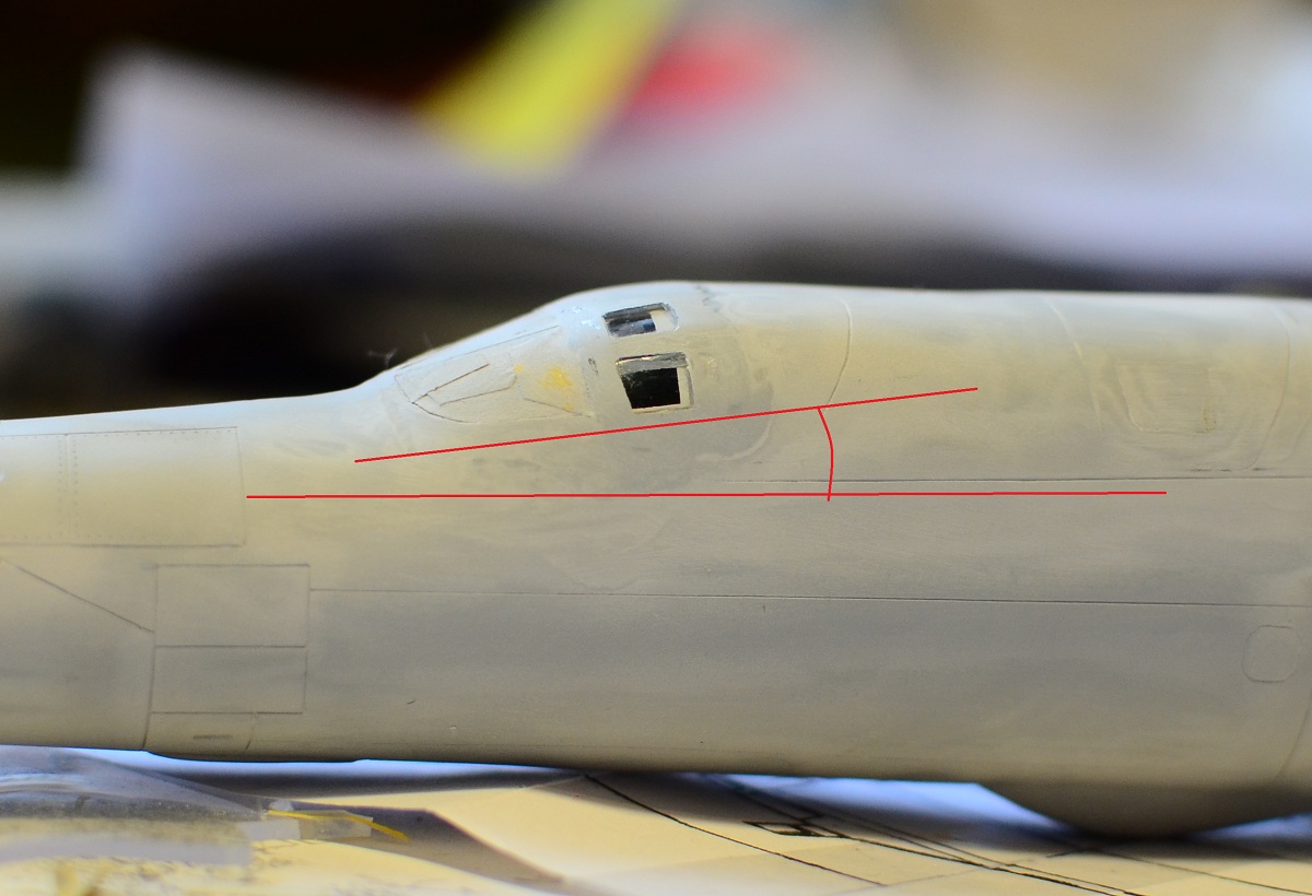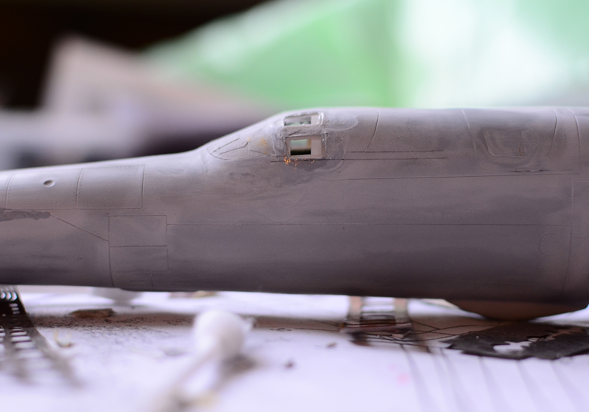 Взял я и приклеил носовую часть с ВЗ к фюзеляжу, где-то это затруднит стройку, но моральный подъем есть. Стройка идет по принципу 2 шага вперед- 1 назад. Очень многие места расшивки я залил грунтом и буду шкурить и резать заново, ибо не нравятся мне траншеи или ровность линии. Кстати по грунту хорошо режется крой. Самая западня- это значительный провал между крышками фонаря по левому боку, пришлось налить тонну грунта что бы поднять этот провал ну и залил линии расшивки, имитирующие крышку фонаря штурмана, что восстанавливать не очень легко, ибо они очень криволинейные. Тем не менее потиху нарезаю все больше кроя, восстанавливаю винты, т.е. процесс идет.
