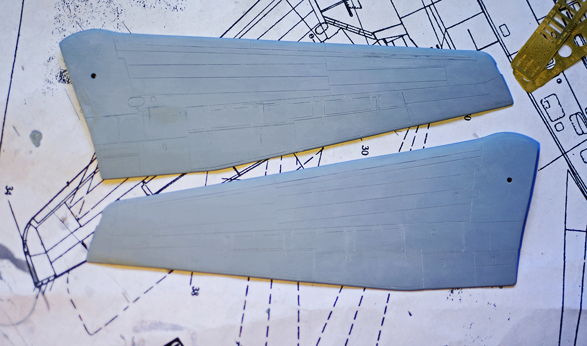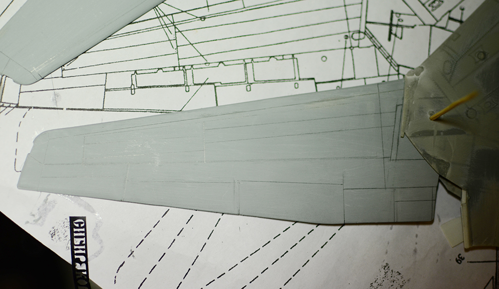 Расшил верх поворотной части крыла, занялся низом. Я доверился чертежам и начал царапать расшивку. Стали терзать сомнения. Нашел фото и сравнил с чертежами, оказалось чертежи приблизительные, много мелких деталей на них нет.