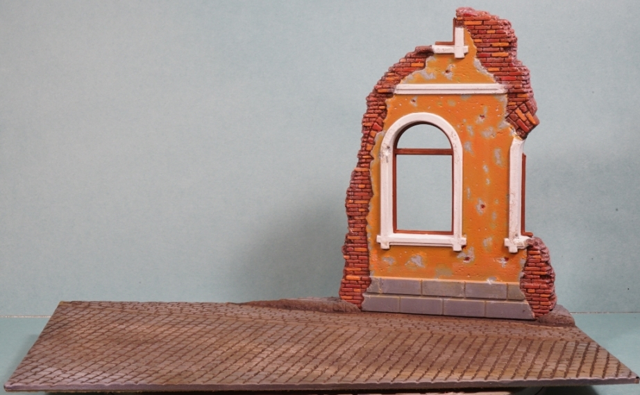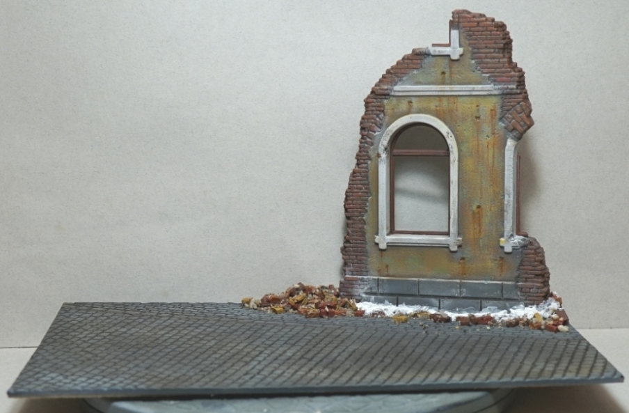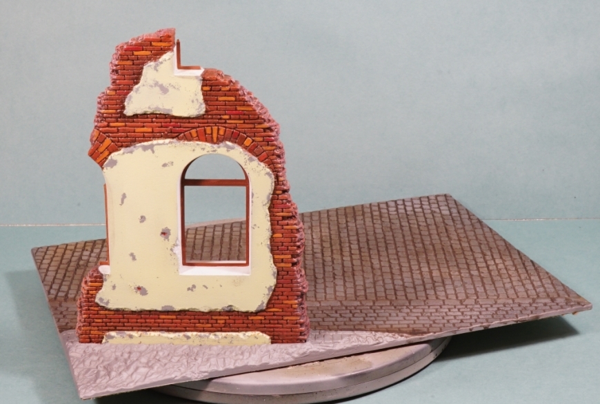 Немного пошкрябал стены, изобразил подтеки штукатурки, накидал внизу кирпичей и камней.
