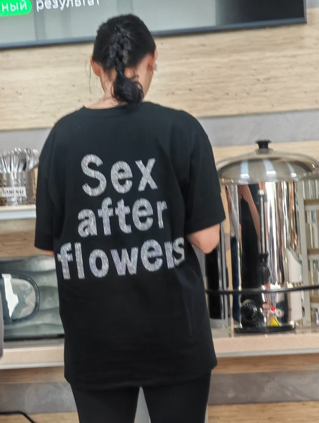 На работе сфотографировал, в столовой. Сидим за столом, обедаем, и вдруг девушка в такой маечке мимо нас дефилирует к СВЧ-печке.