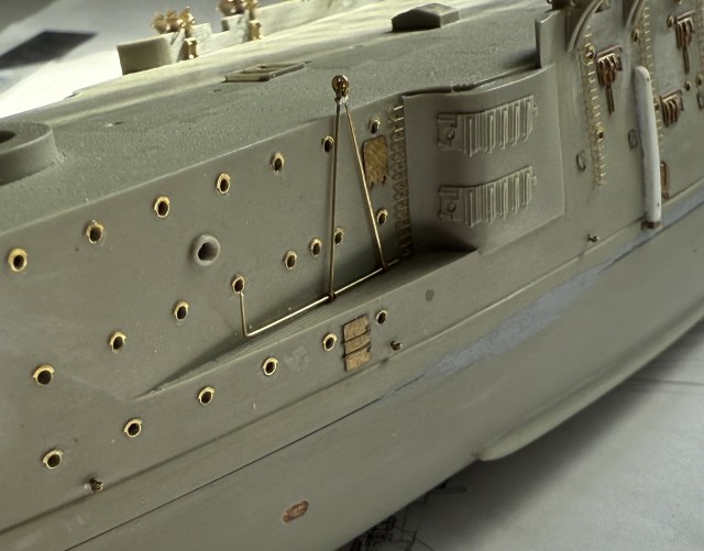 3.По ресничкам. Труд конечно огромный, но честно сказать это сильно далеко от того что было и сильно не масштабно. Зря вы отказались от травленых иллюминаторов с козырьками. То, что их было маловато в наборе не является объяснением, поскольку подготовка допов у вас была очень солидная и явно затратная как по средствам так и по времени. Запрсто можно было бы купить отдельные киты с травлеными иллюминаторами с ресницами. Дело в том, что именно в период РЯВ на кораблях РИФ отечественной постройки водосливные козырьки были частью наружной рамы иллюминатора. То есть они были почти вплотную к световому проему иллюминатора в масштабе 1/350. Руками так сделать из отдельных деталей очень сложно и травление здесь сильно бы помогло.