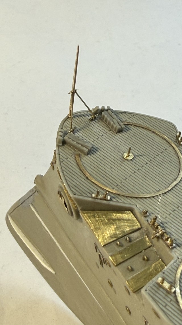 По носовому мостику. Он к сожалению еще не доделан и там предстоят еще работы по коечным сеткам откидным фальшбортам спереди и как раз этот самый уступ о котором вы сказали. На фото он был не только вдоль коечных сеток а по всему периметру мостика заканчиваясь у бортовых орудийных площадок.