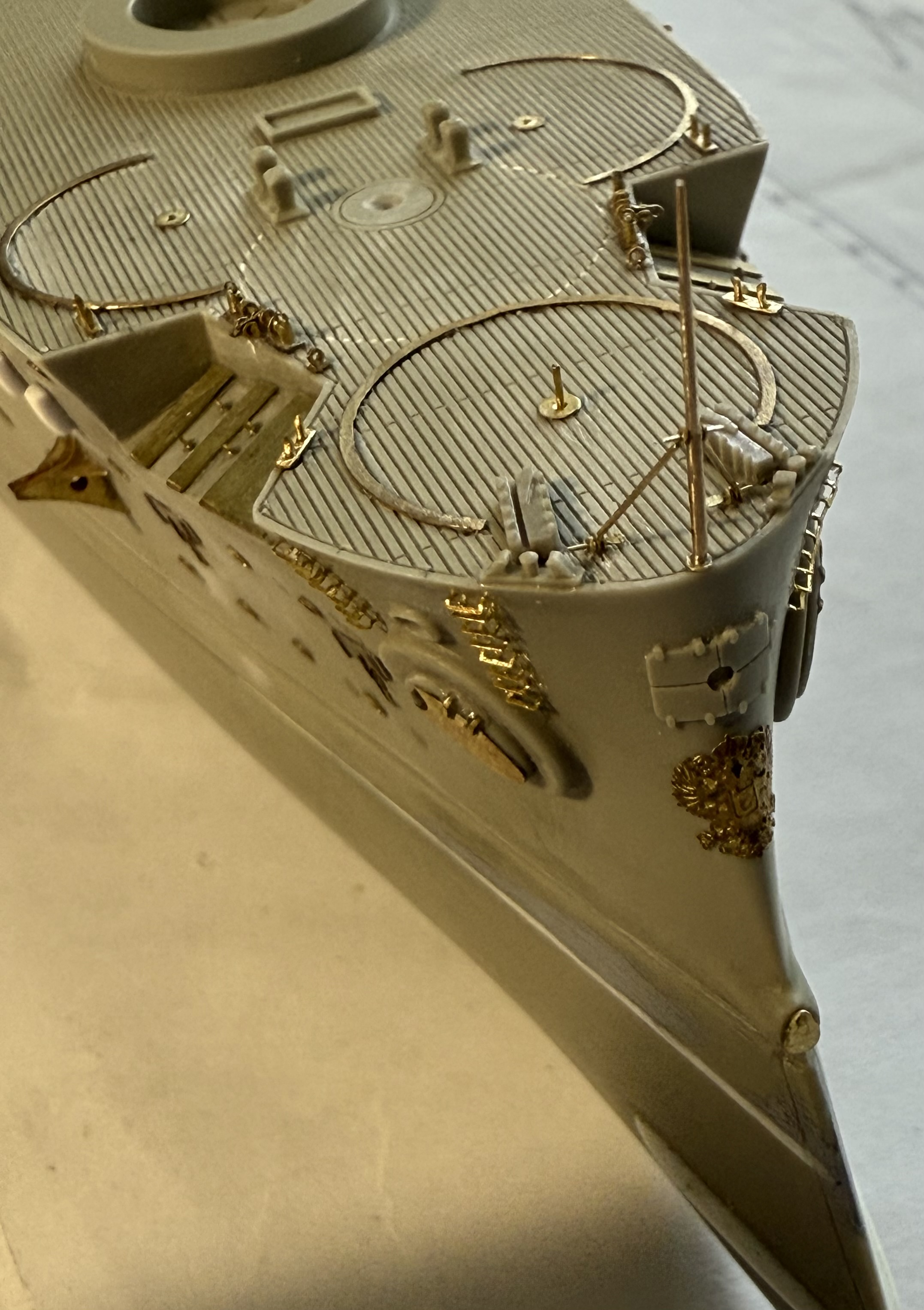 Продолжаем работу с якорным хозяйством броненосца. Поставил на полки якорей полосы усиления и разместил для примерки якорь с цепью. Дополнительно обвязал его пертулинями и найтовыми чтобы показать как это будет в итоге. Лапы правда не найтовал, хотя рымы на якорной полке для этого уже тоже стоят. Поставил крышки клюзов. Крышки похоже на Ослябя были оригинальные, взял те, что были в наборе от производителя. Чертежей этих крышек у меня нет, ориентировался на доступные фото броненосца.