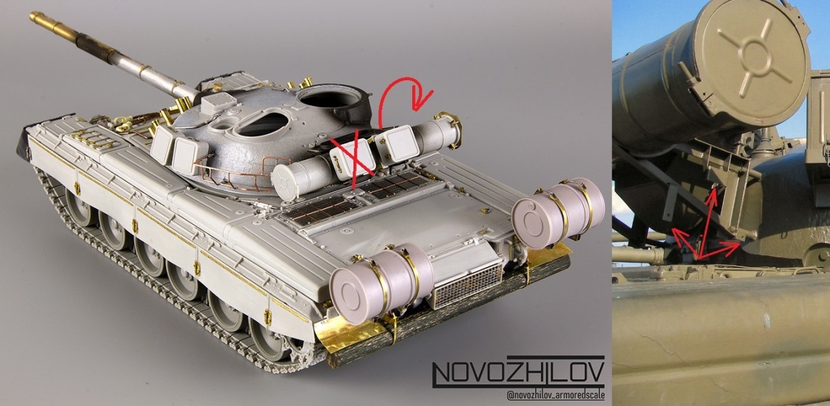 Не совсем понятно с прототипом. Если "классический" Т-80Б, то один ящик АТ нужно убрать, а второй перенести, как на фото. Были случаи с 4 ящиками, но они единичны.