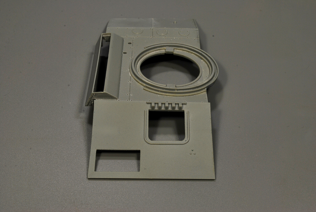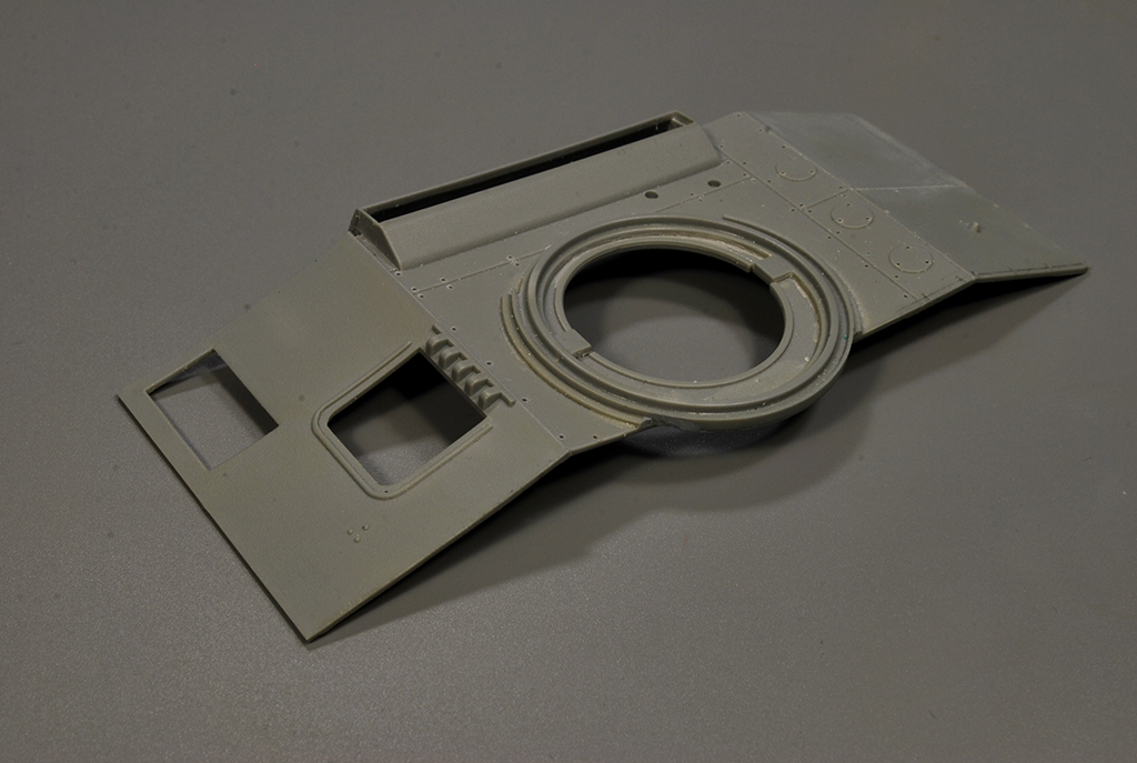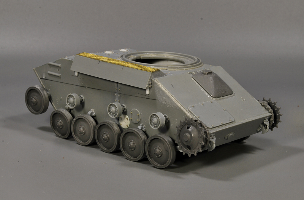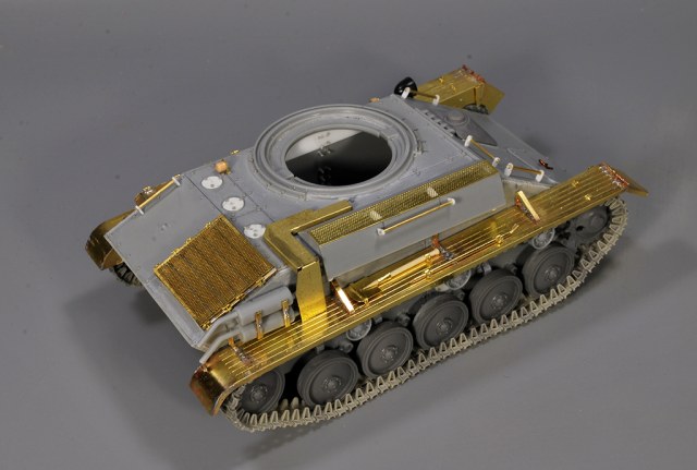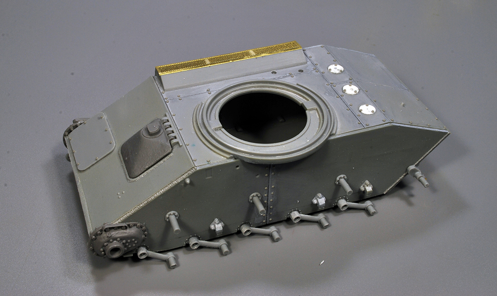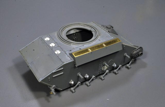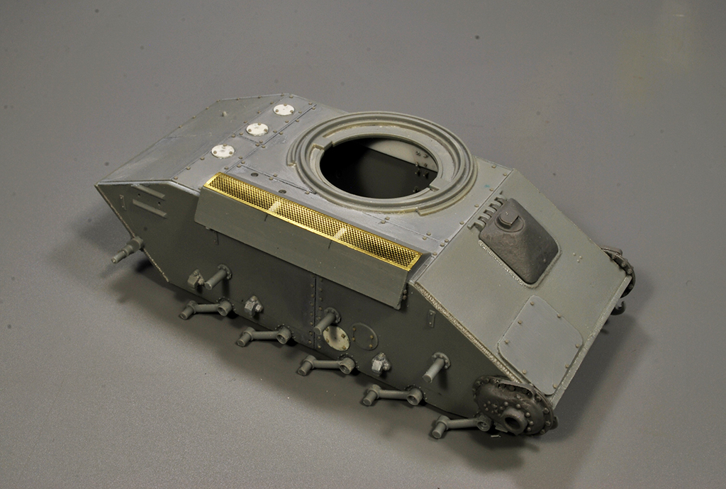-заменил надмоторную решетку на Вояджер от Т-70. Решётку решил оставить как на Т-70. Опять же вертикальное расположение креплений для сетки на фото опытного образца ничем не обусловлено на серийных машинах.