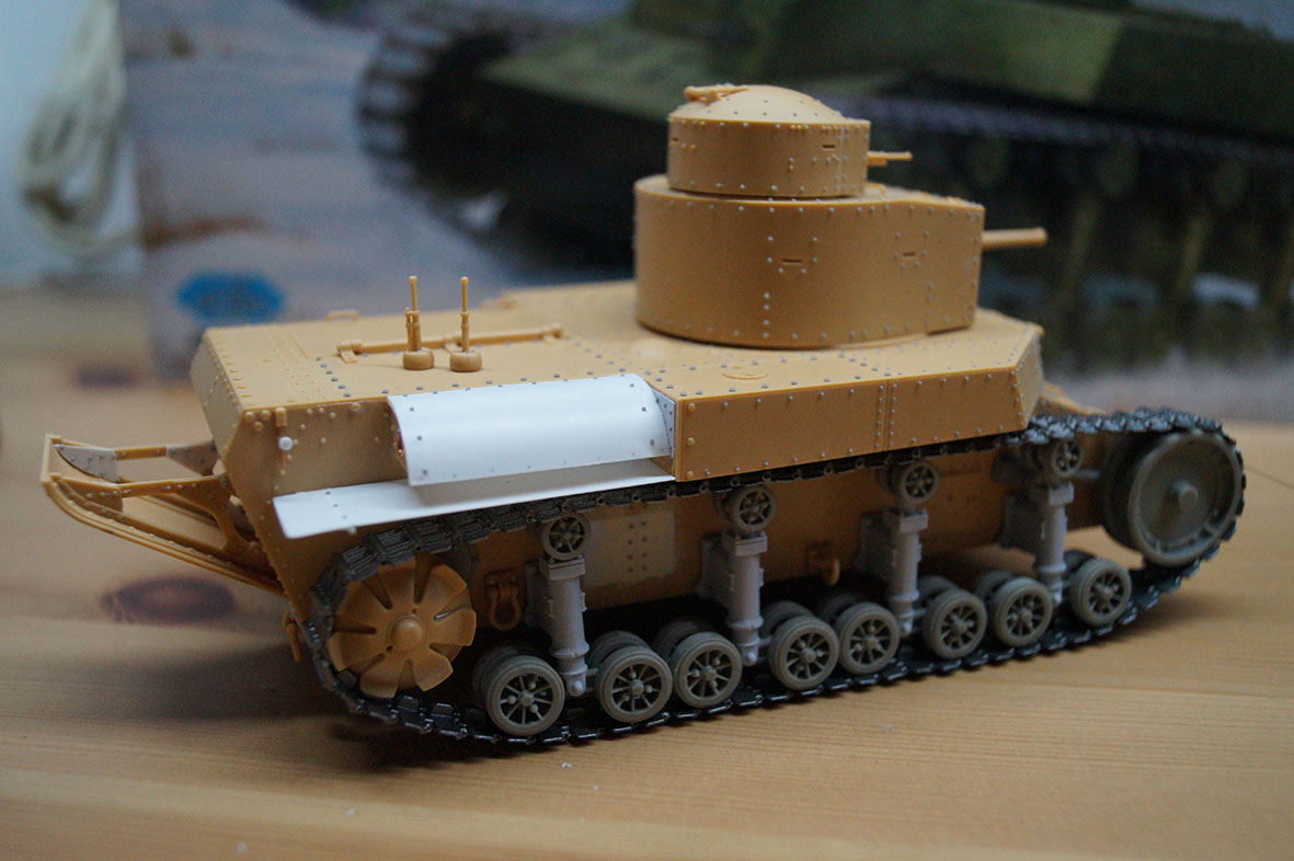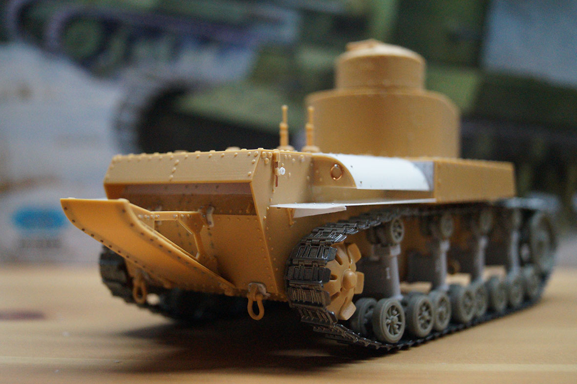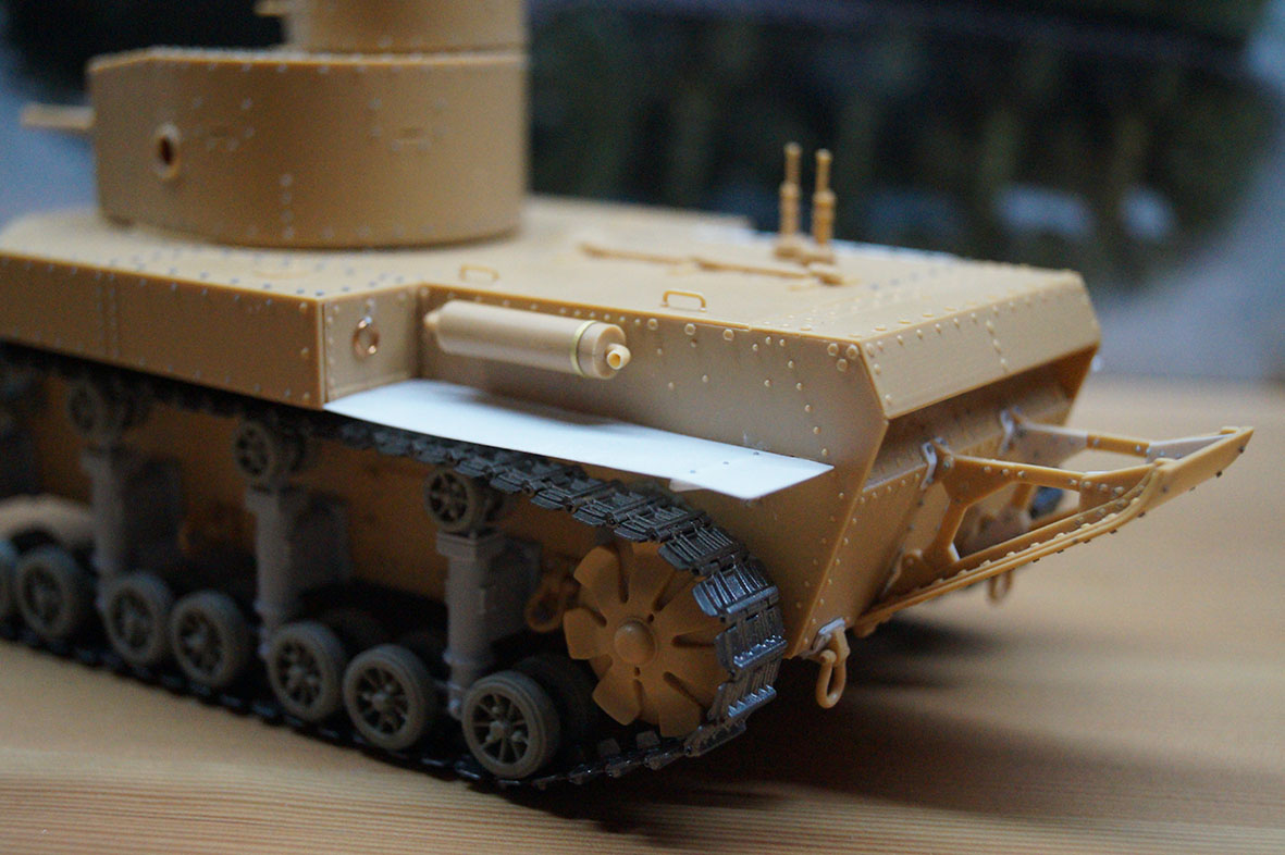дело понемногу движется, в принципе, почти подошел к покраске, осталось из крупного только сделать цепь (это быстро умеючи), и укрепить и зашпаклевать уже имеющееся. Победил жо..(корму), насколько мог! Этот глупый хвост, отнял очень много сил и клепок, так же ходовая, оказалось я отвык от смолы совсем (понятное дело смола это круто, но ее еще нужно облагородить, а я отвык). Сделал крепления хвоста и крепления буксиров правильные пластик от карт и доширака наше все, сделал крылья и воздухозаборник (по крайней мере я думаю что это был воздухозаборник...) Сделал ложную сборку (ходовая по правому краю не закреплена вообще поэтому гуляет) и сравнил с т-34 (по габаритам очень похож оказался) вот пока все...