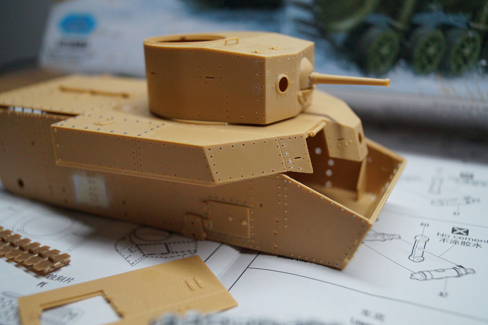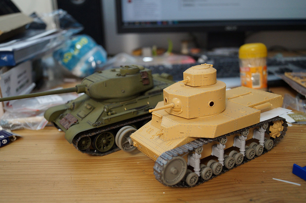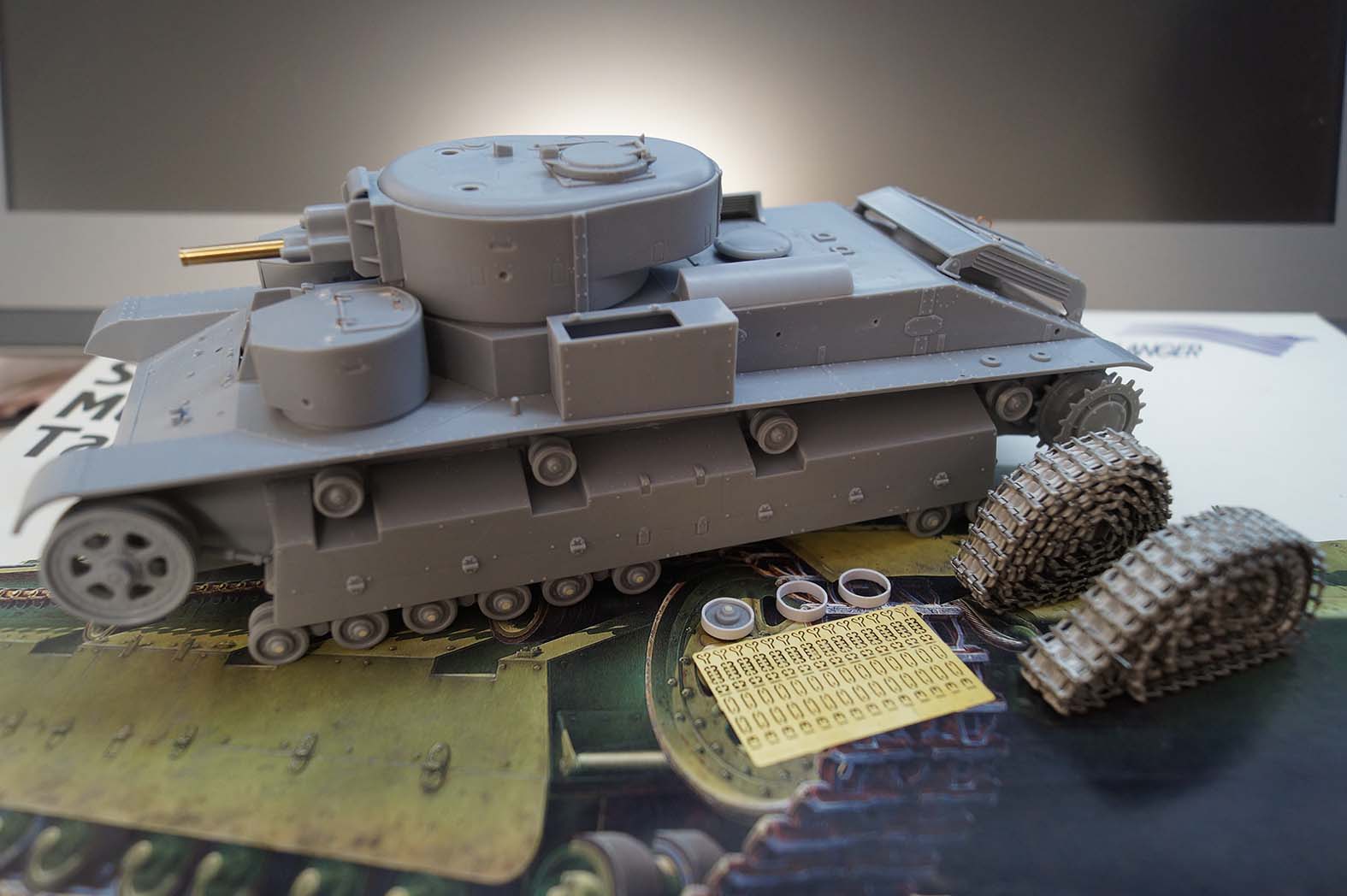 Решил оформить стройку танка т-28, алангер. Модель была куплена 12 лет назад у одного каробчанина за 2000 рублей ввиду отсутствия (тогда) альтернатив на рынке. И вот решил приступить к его постройке, так как фирмы давно нет, а пресс формы уничтожены, то это раритет, который в данном варианте больше не будет, и имеет большое право на уважение и достойный к нему подход. Тотального запила не планирую с изменением геометрий башен чтоб они вписывались в коломийца и всего такого не планируется. Но и модели выходного тоже не будет. Фронт работ большой, сил, вдохновения и знаний - нет! Поэтому надеюсь на вашу помошь в мотивации (пинать меня) и знаниях. Работа нахотится на нулевом этапе поэтому показать пока нечего, ну вот пару фото в качестве демонстрации того, что есть в наличии: ствол, гусеницы, травления в магазине не было пришлось обойтись нейлоновой сеткой от фильтра системного блока и прорезать жалюзи, сделать петли башенок и створки жалюзи рабочими также рабочие ручки люков на башенках.