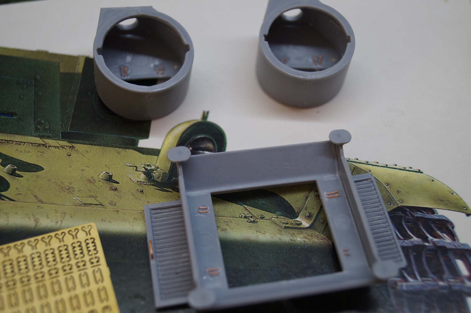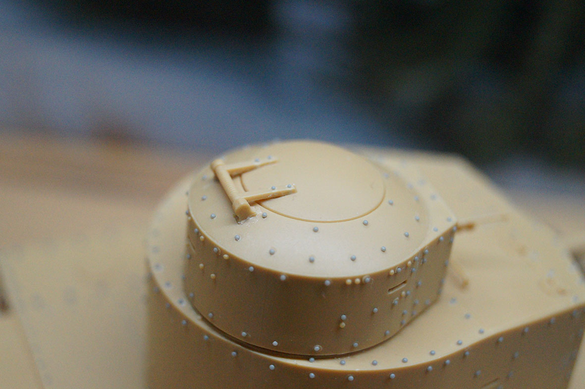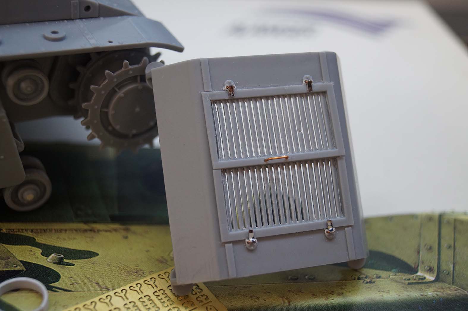 Проект всё еще жив и даже немного дергается, прислали мне фары от WBT и пулеметы, от SPM пришли домкраты. Левое крыло склеил, правое спаял (не очень вышло, зато научился паять травло). Разобрался с шанцем, осталось штурмовать передний бронелист (крепеж фар и клаксона и многочисленные барашки фиксации фар).
