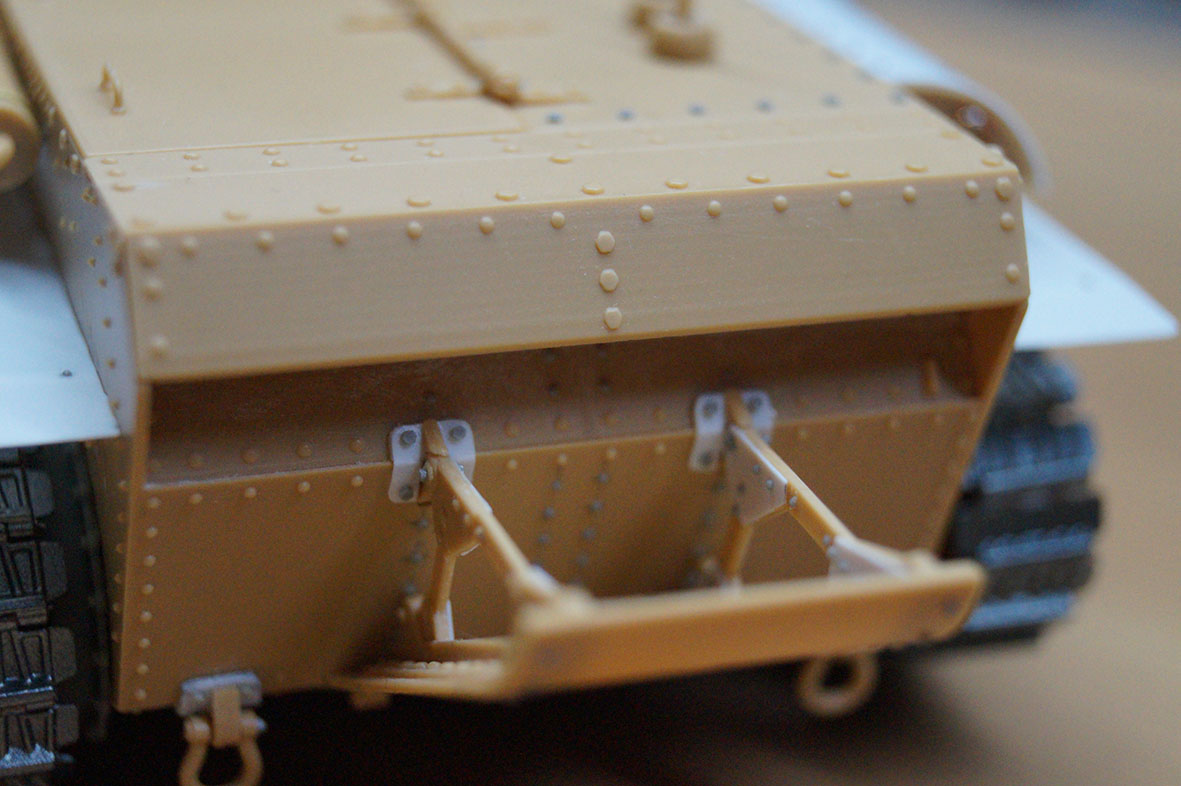 Там прутком не обойтись, саморез вкручен в палочку от ватной палочки; саморезы нужны, для того чтобы можно было снять ленивец и натянуть гусеницу. Это как делать ремонт в хрущевке, если делать все по уровню и линейке, то будет все криво, нужно делать оттталкиваясь от положения стен, которые были кривыми изначально. Вот и тут две одинаковые гусеницы по количеству звеньев, с одинаковым выносом ленивца, имеют обсолютно разный провис. Тут просто 3 разных производителя дополнений, которые дедали свои дополнения вообще для другой модели). А шлицы саморезов перед покраской все равно зашпаклюю, так что все норм.