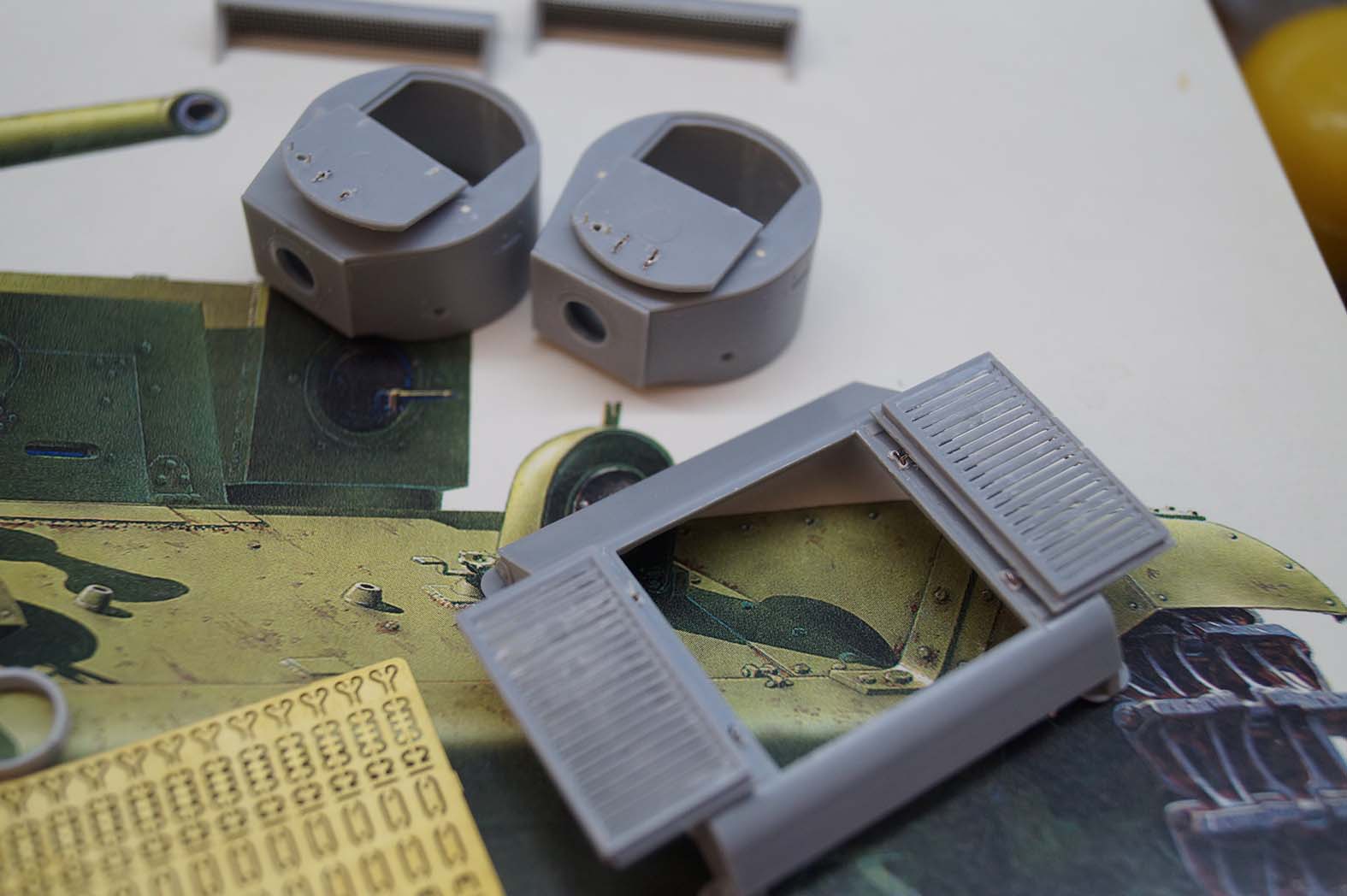 Зрение не воссатновилось полностью и многие вещи делал на ощупь, такие как пулеметную турель от микродизайна, всего от микродизайна было заказано 3 набора: полки, мелочевка и турель, идельный вариант был бы Эдуард, но не так просто найти нынче снятый с производства набор травления для снятой с производства модели. Вчера был знаменательный день, вчера доделал все люки с рабочими петлями, клепка правильная пока только на люке мехвода (на одном из 3х). Всего я насчитал 13 рабочих люков. на танке. Пока все...забыл скакать, крышка люка на турели от БТ-7 ВЭ (для него был заказал зип комплект без турели и правильная крышка освободилась)