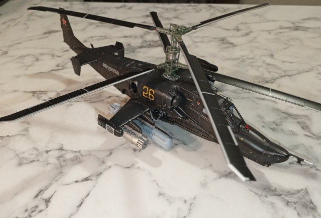 Аккуратная модель, в целом красиво! Но на мой взгляд основной цвет у вас темноват, и ушёл в больше в коричневый. Впрочем возможно цветопередача хромает. Я тоже купил Ка-50 от Армы, аж две штуки. Одну собрал, 26 в чёрном камуфляже, вторую планирую 25, как у вас. Два нюанса заметил, перископ на кабине нужно было разрезать, и делать из двух частей, и над фильтрами двигателей, верхнее крепление как у Ка-52. Из того что сразу в глаза бросилось.