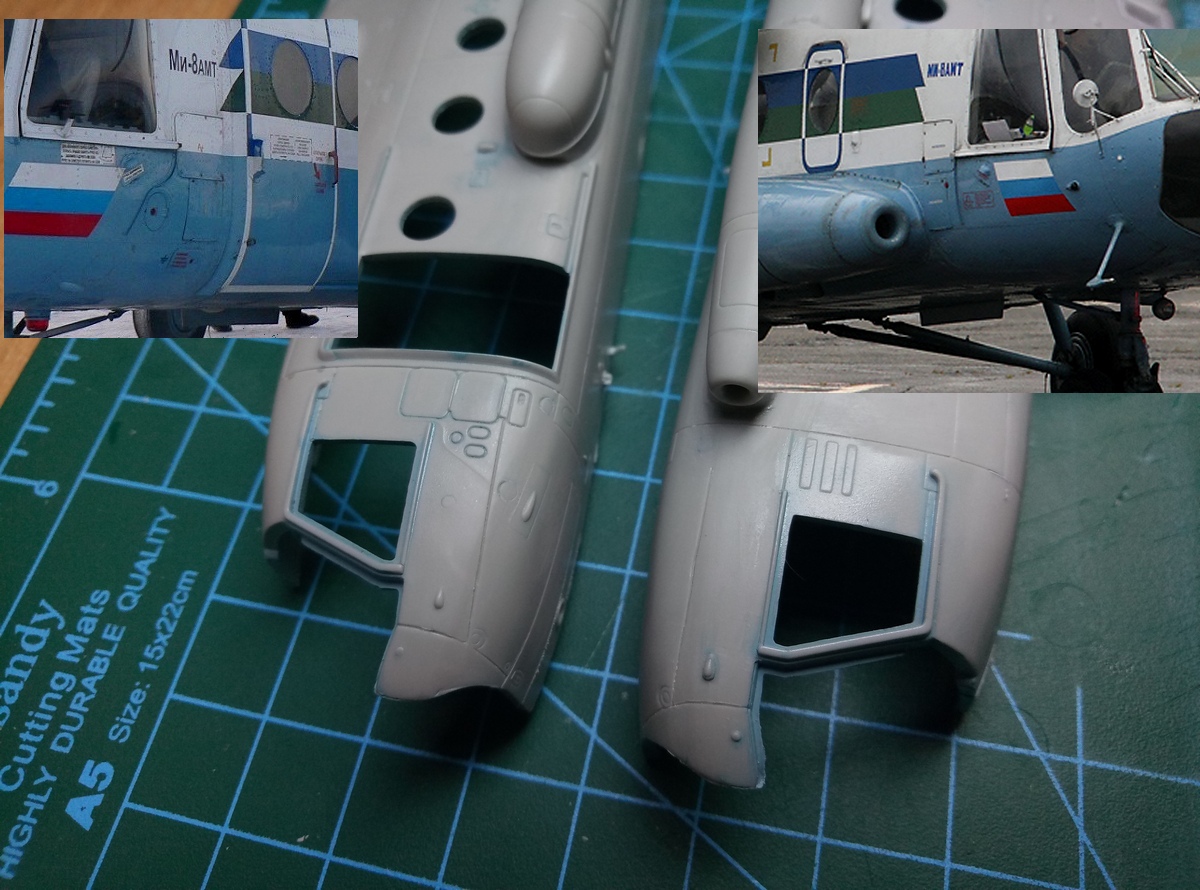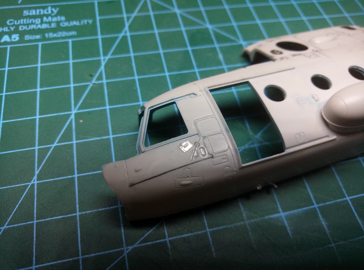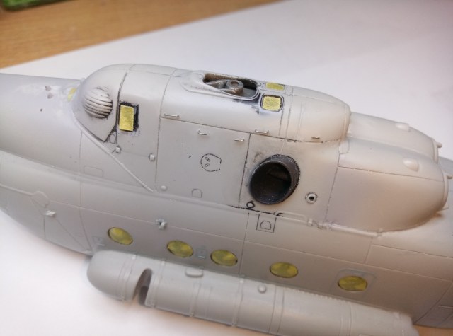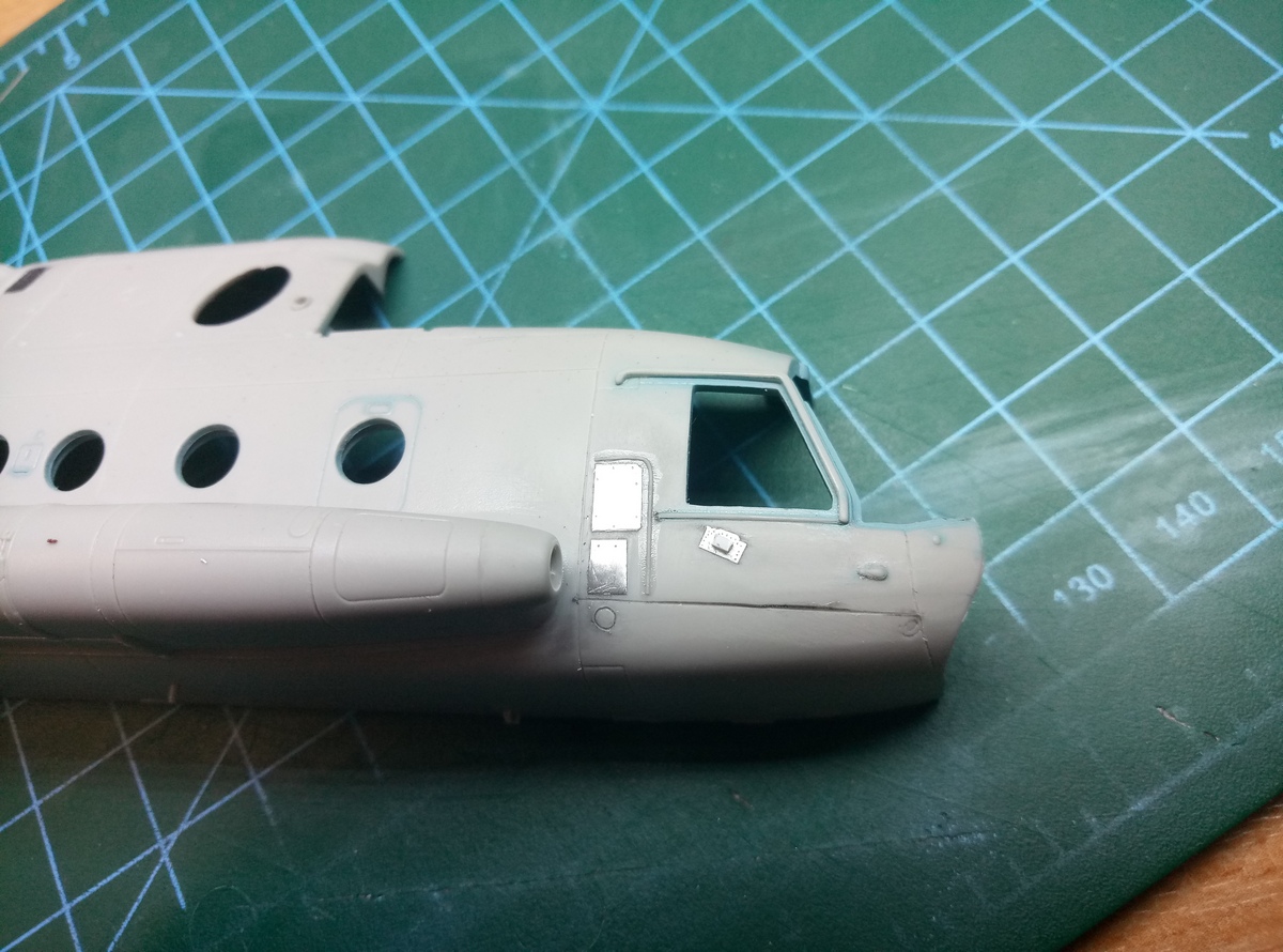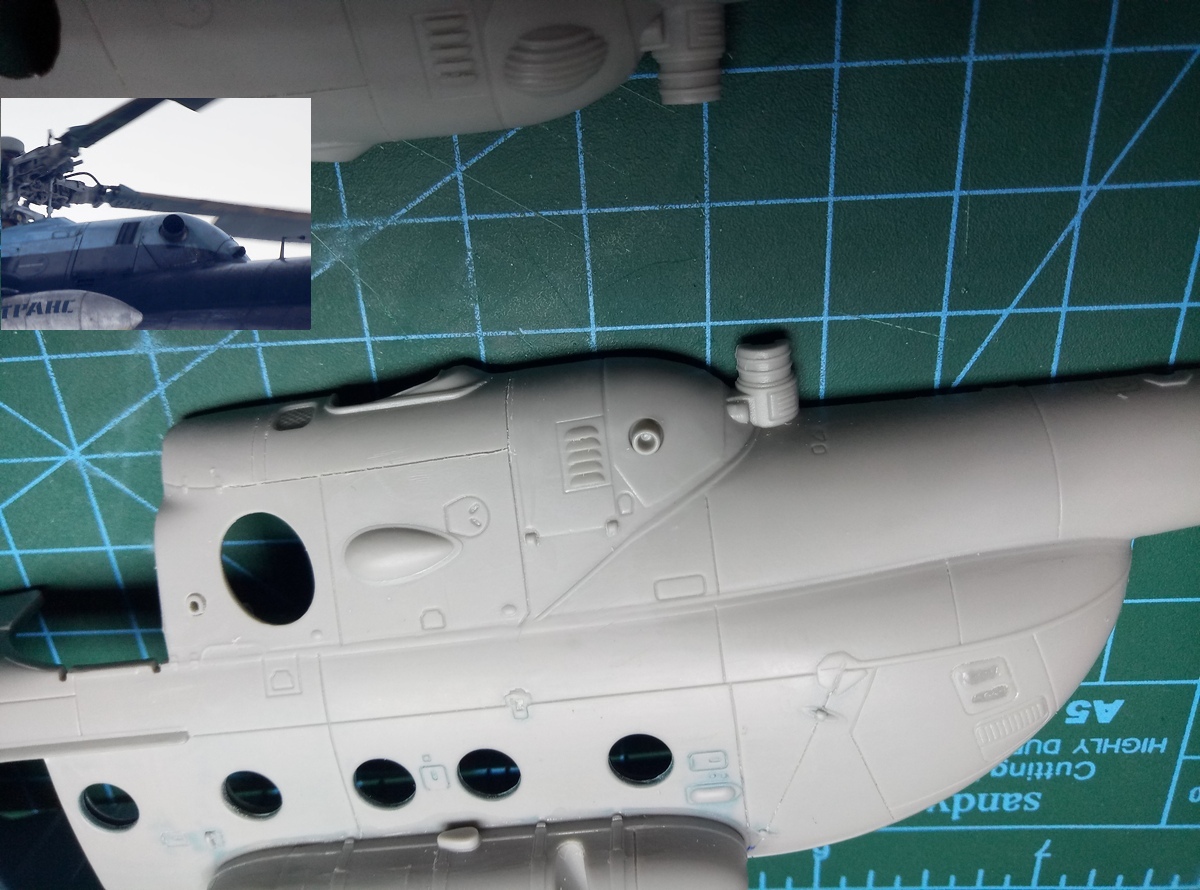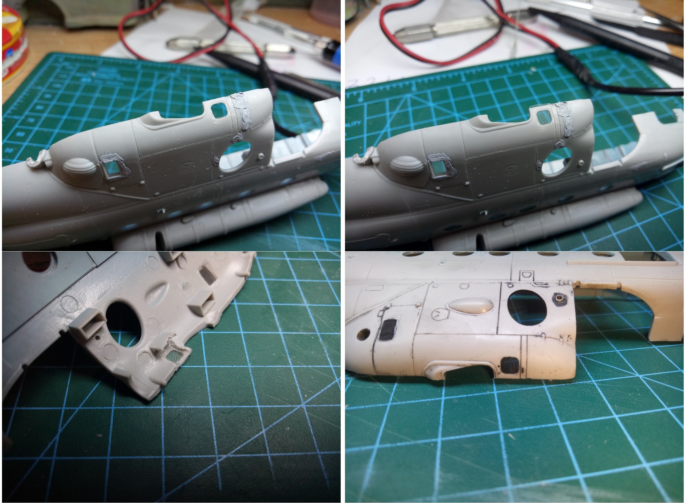 Сделал по фотографиям внешние боковины кабины, лишнее зашпаклевал суперклеем. Сделал вместо жабер сетку по бокам вертолета, как на прототипе. Также заменил на сетку пластмассовую имитацию в верхней части вертолета.