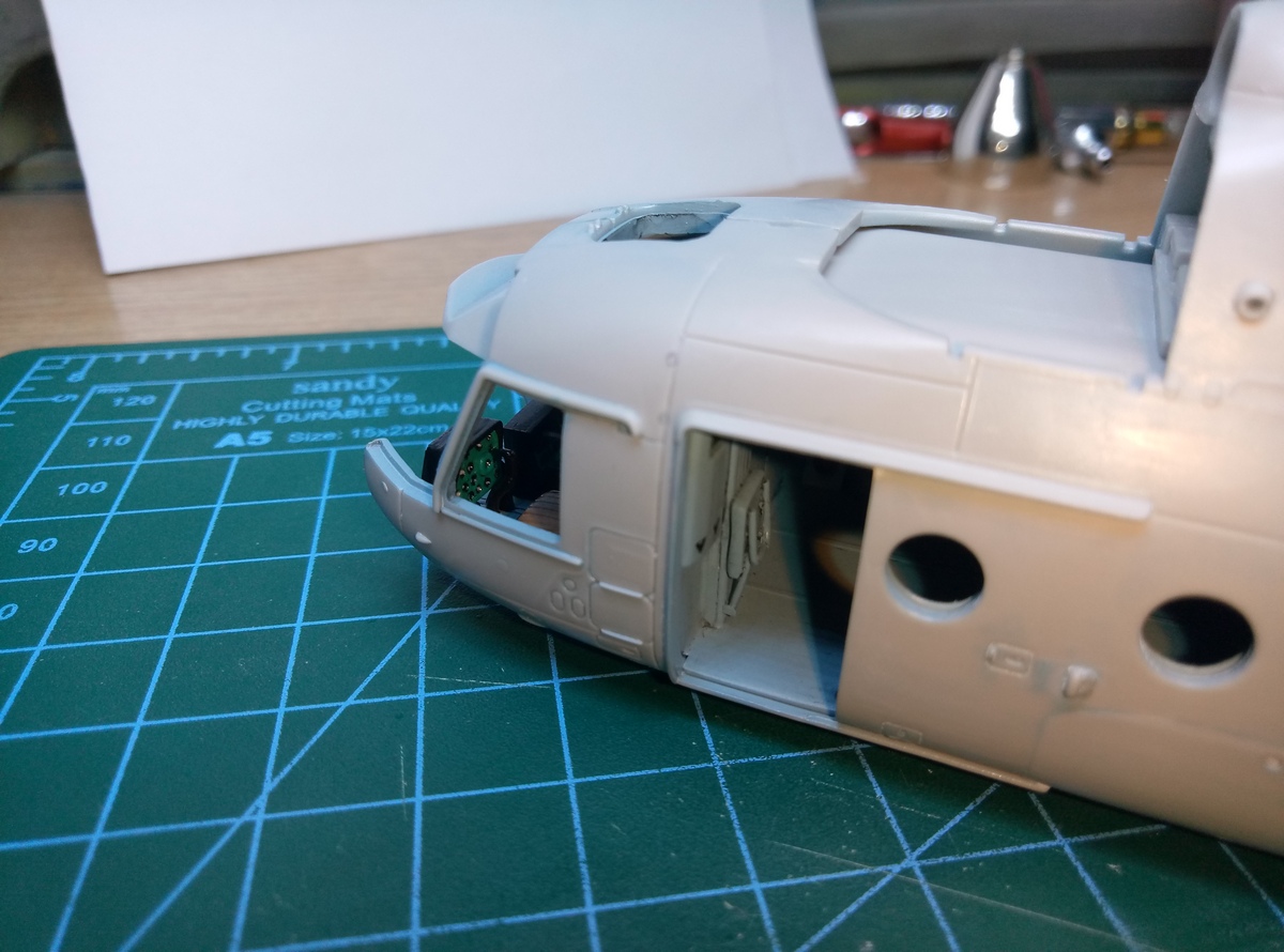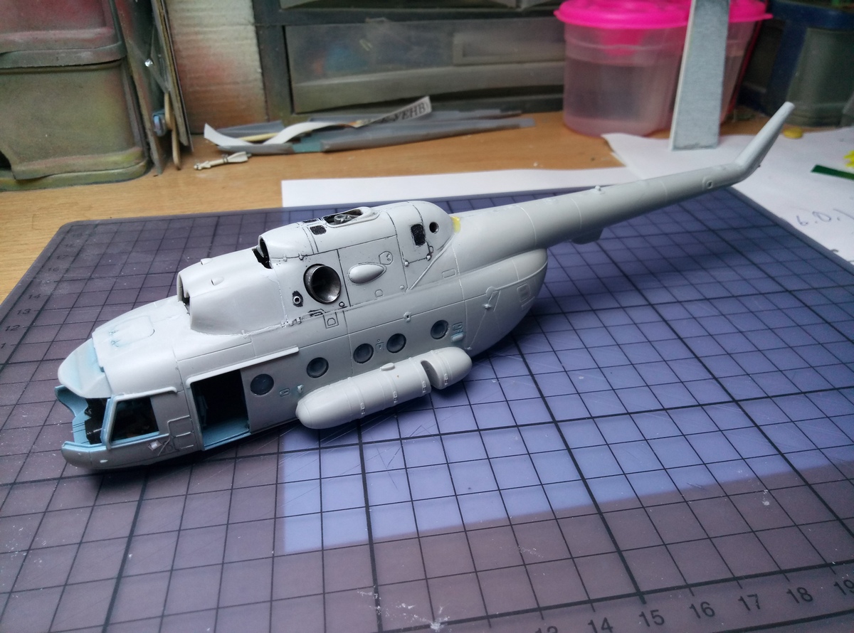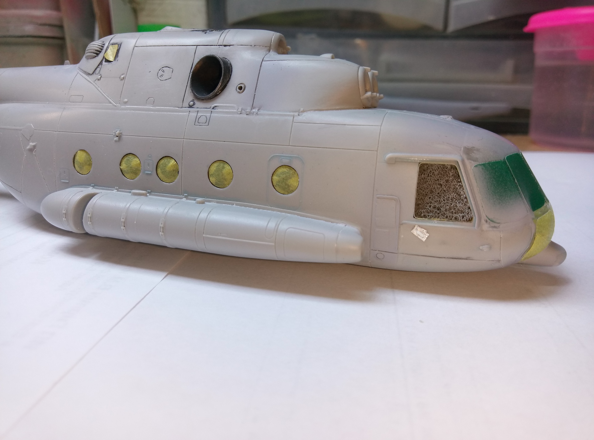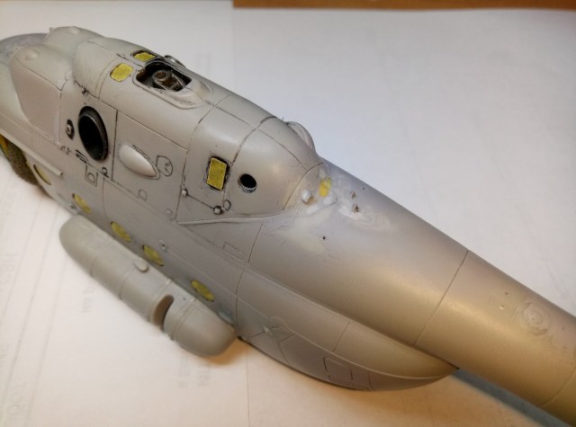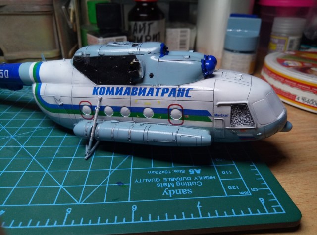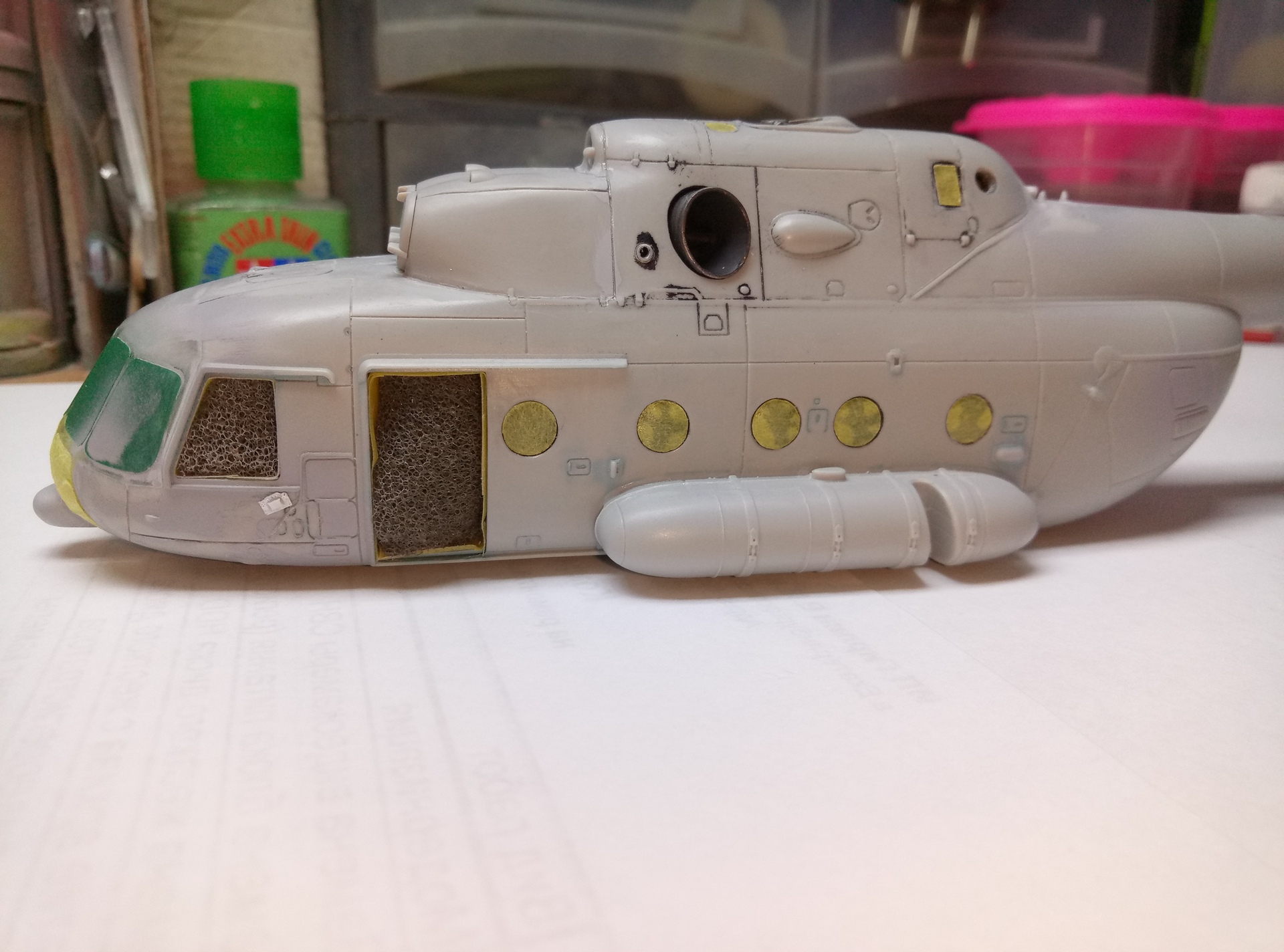 Сделал по фотографиям внешние боковины кабины, лишнее зашпаклевал суперклеем. Сделал вместо жабер сетку по бокам вертолета, как на прототипе. Также заменил на сетку пластмассовую имитацию в верхней части вертолета.