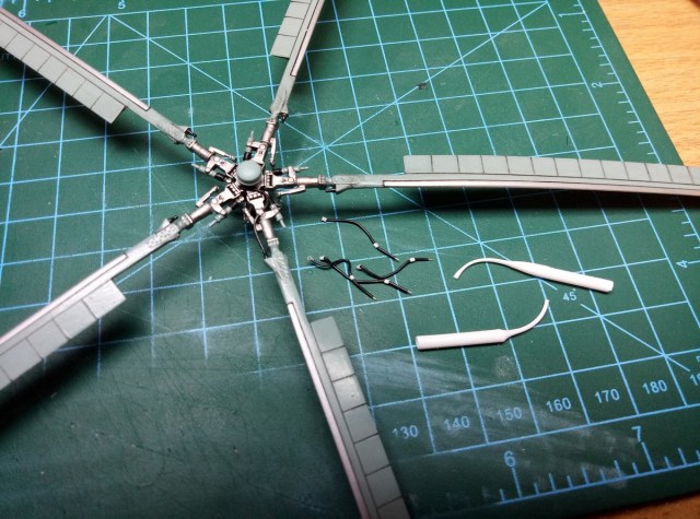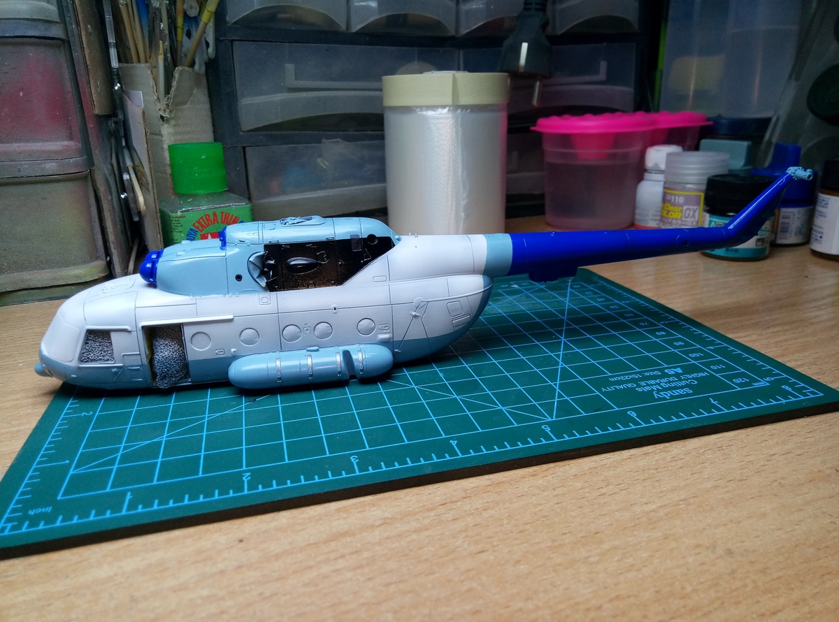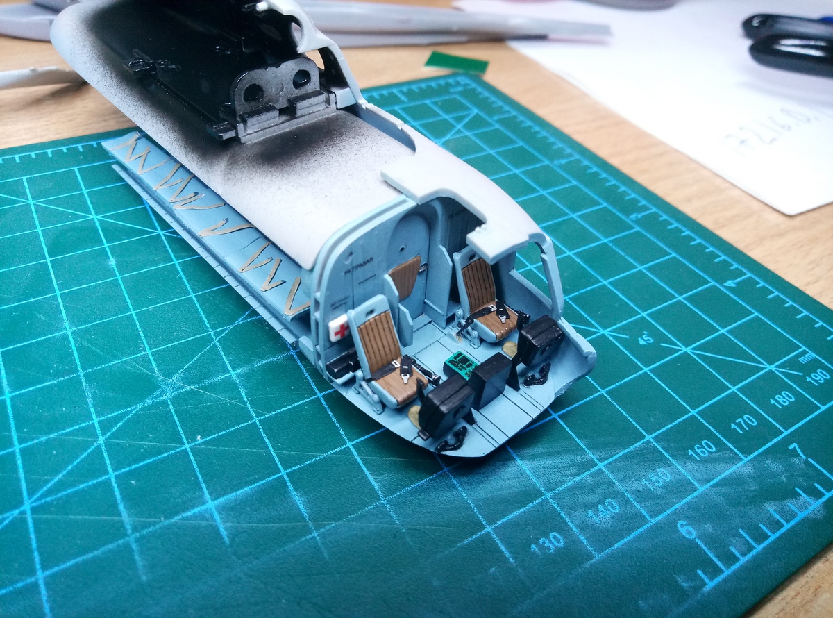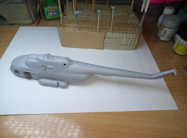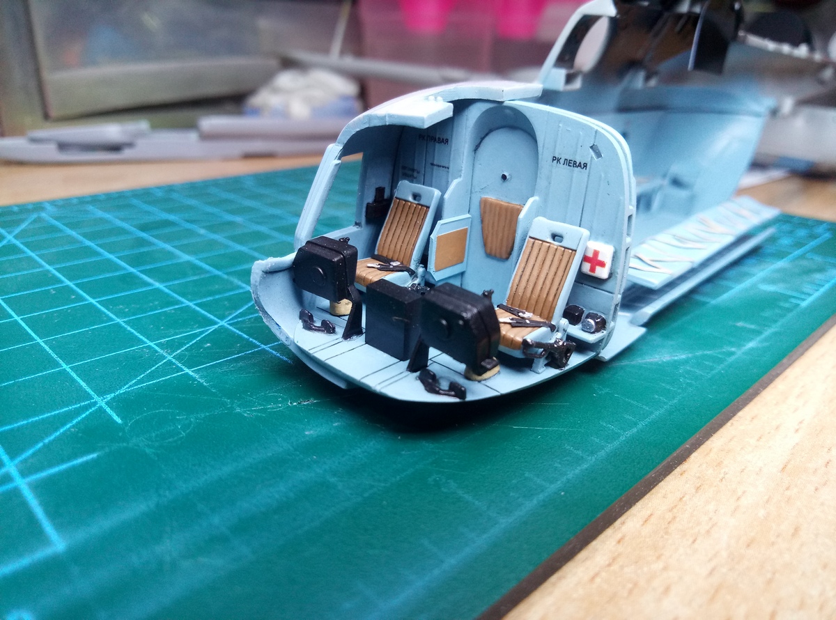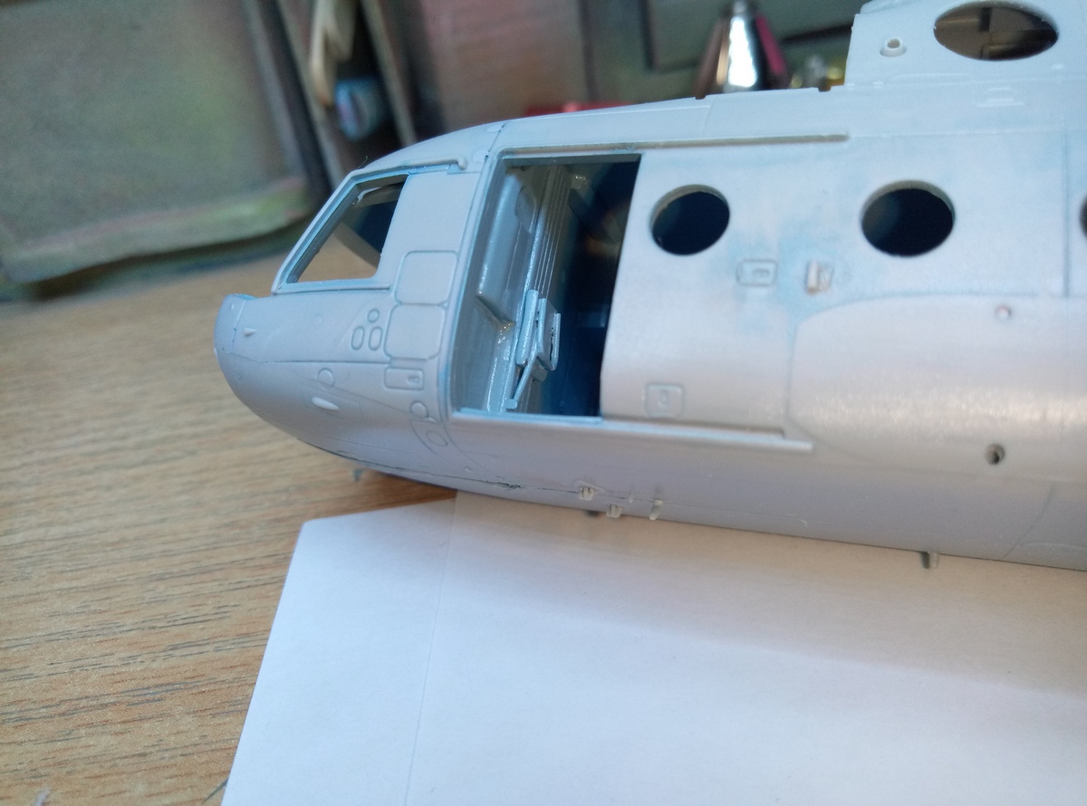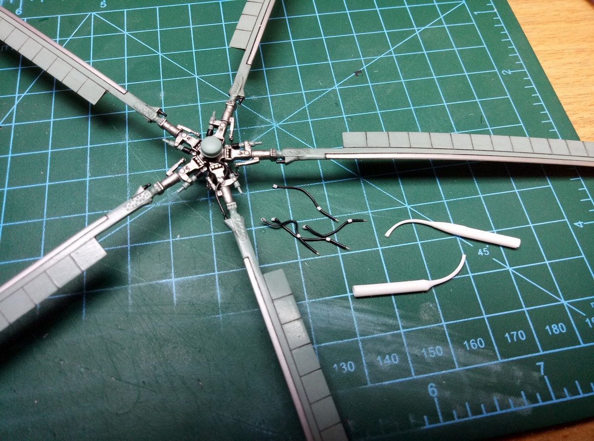 Сделал по фотографиям внешние боковины кабины, лишнее зашпаклевал суперклеем. Сделал вместо жабер сетку по бокам вертолета, как на прототипе. Также заменил на сетку пластмассовую имитацию в верхней части вертолета.
