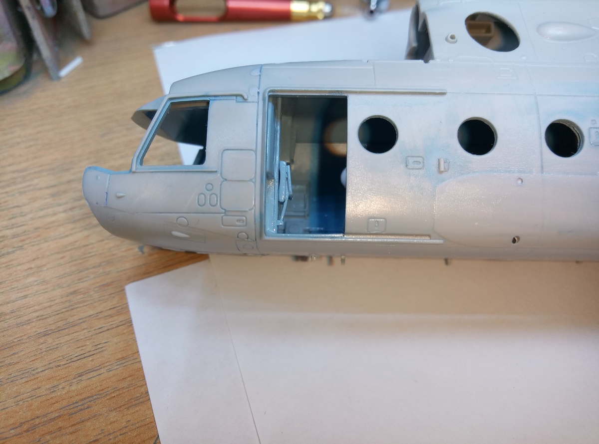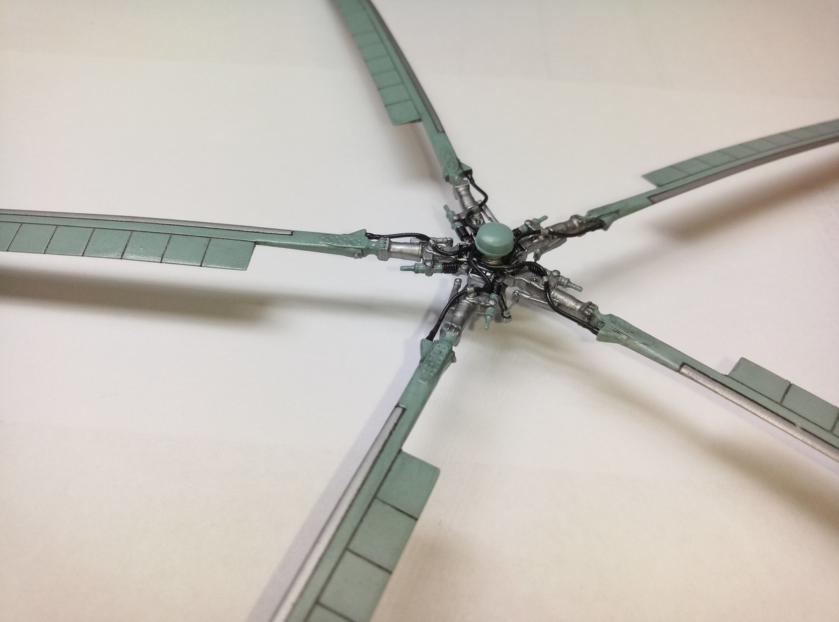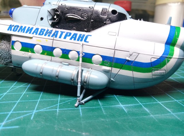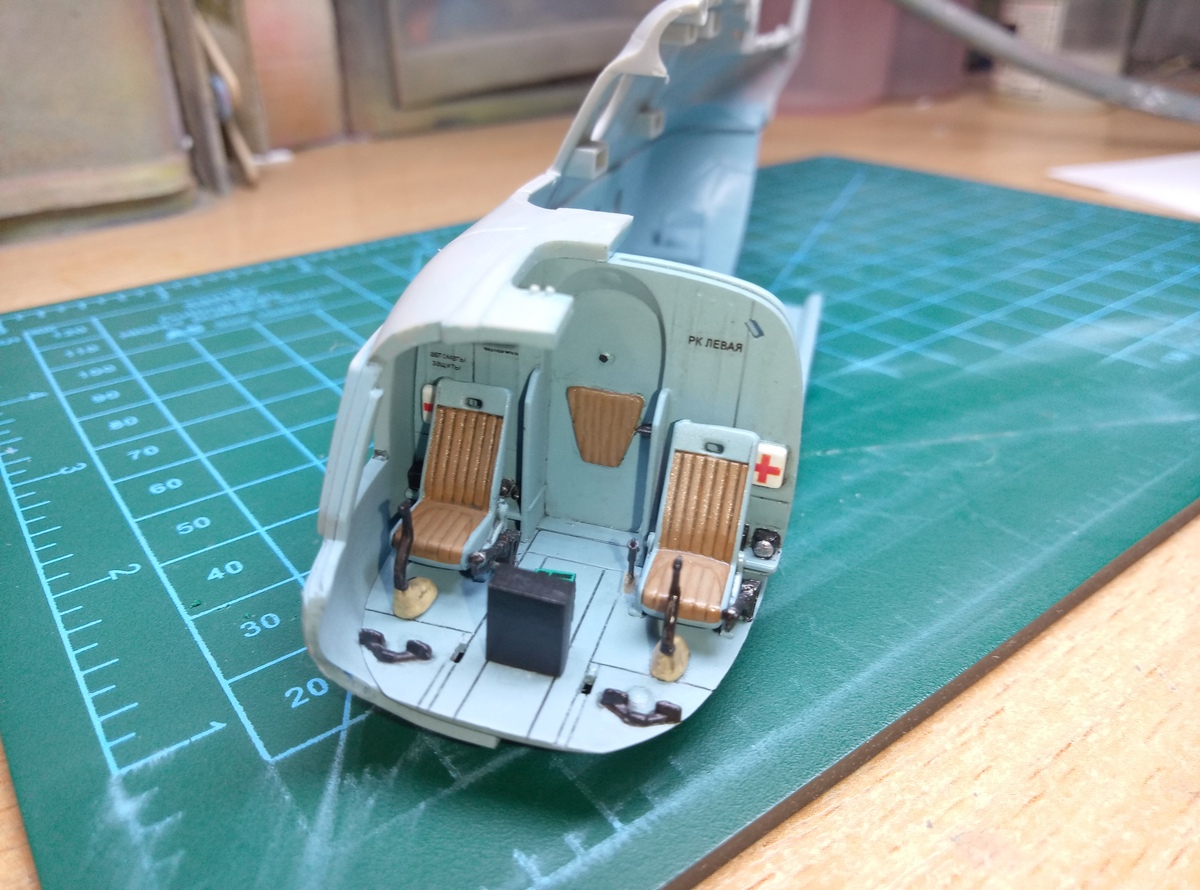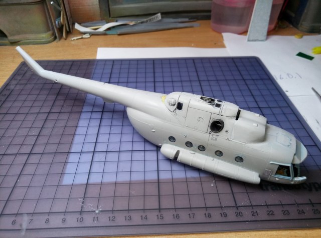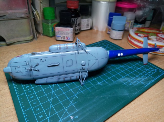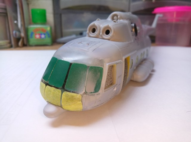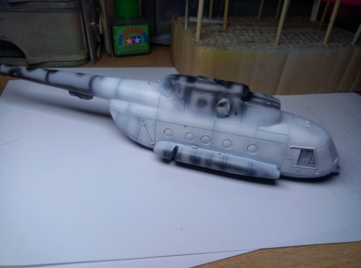 Сделал по фотографиям внешние боковины кабины, лишнее зашпаклевал суперклеем. Сделал вместо жабер сетку по бокам вертолета, как на прототипе. Также заменил на сетку пластмассовую имитацию в верхней части вертолета.