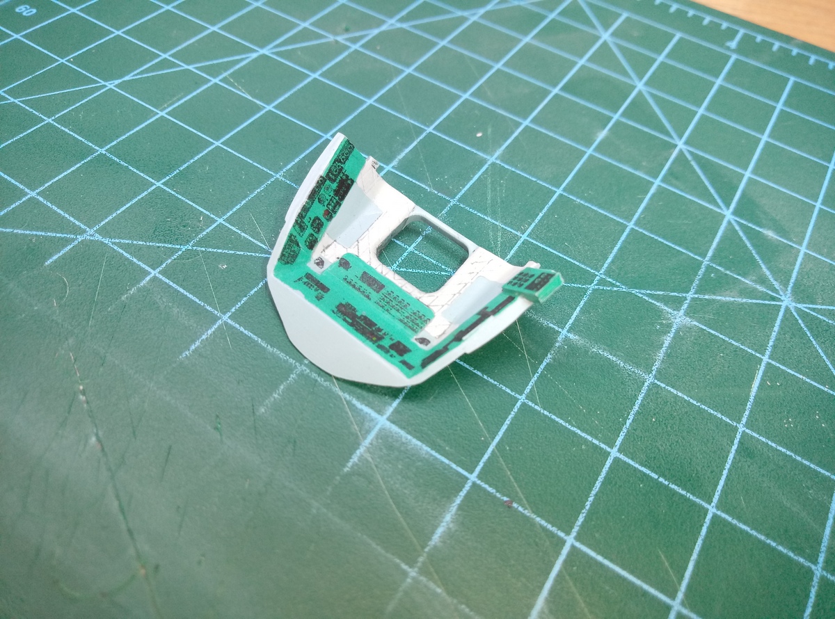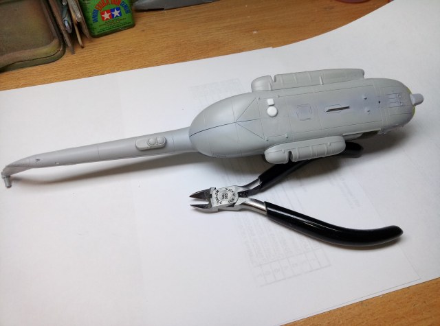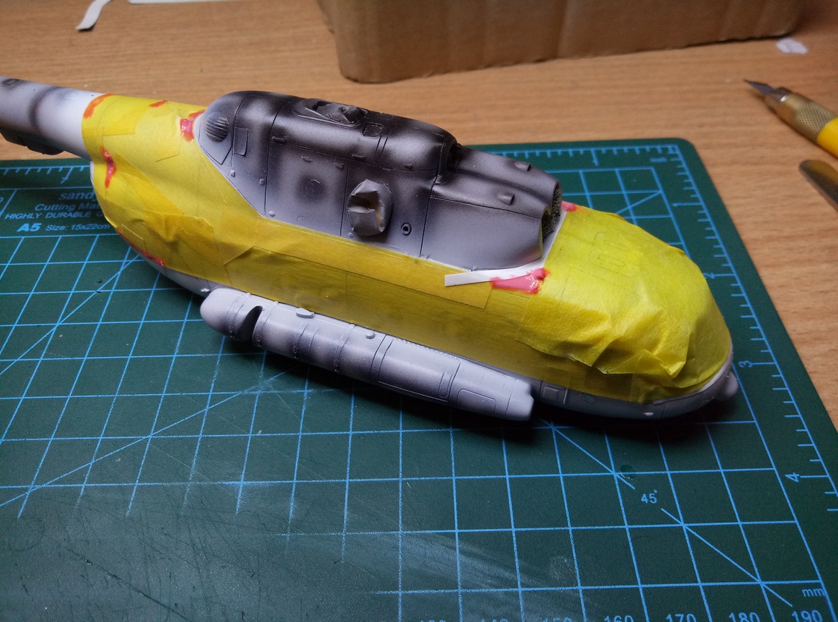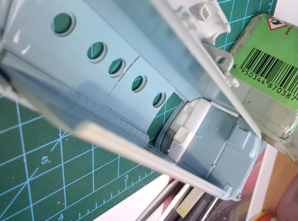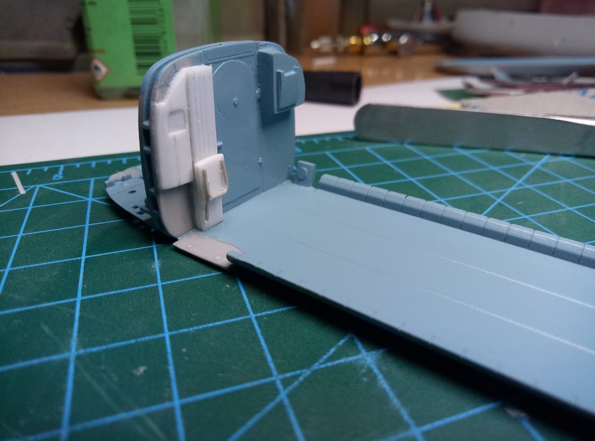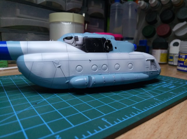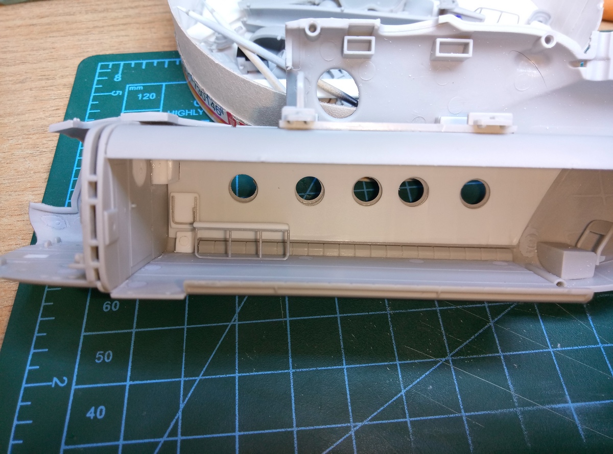 Сделал по фотографиям внешние боковины кабины, лишнее зашпаклевал суперклеем. Сделал вместо жабер сетку по бокам вертолета, как на прототипе. Также заменил на сетку пластмассовую имитацию в верхней части вертолета.