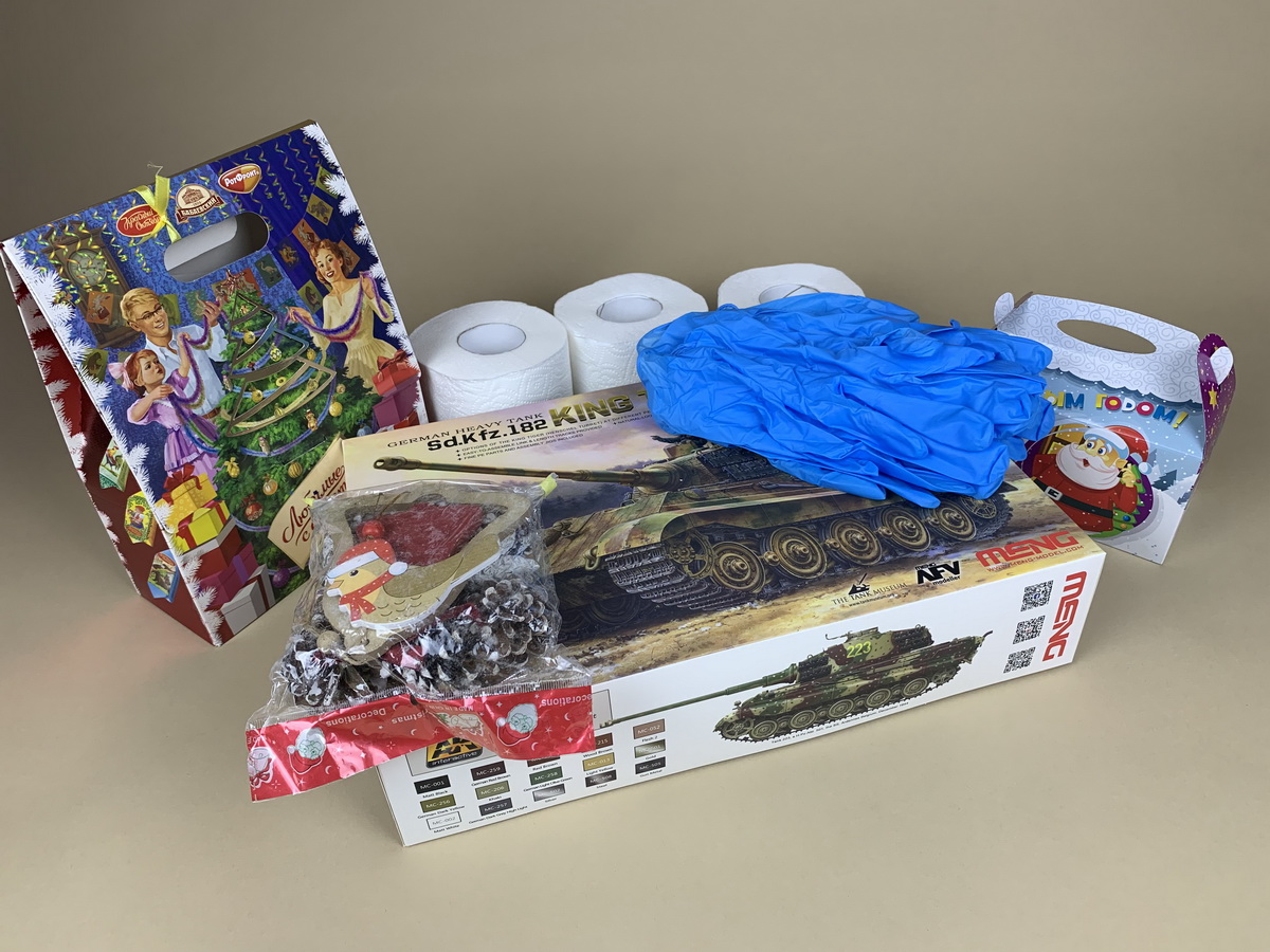 В волшебном ящике лежали два набора конфет (к ним уже жена, дети и внук протянули свои ручки), шишки с игрушкой (займут свое место на елке), перчатки (для правильной окраски модели) и три рулона Пипифакса (вещи в быту незаменимой и кончающейся в самый ответственный момент)!