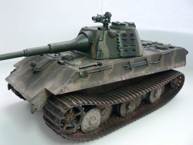 Отличная работа!Объём работ впечатлил! Покраска очень понравилась! Но не хватает блеска оптики - он очень бы оживил модель. И не понятно это прототип или боевая машина? Если прототип то откуда на нем след от попадания снаряда, а если боевая то где весь шанец? На башне показались тонковатыми стенки.И ещё думаю если бы его обуть в боевые гусеницы смотрелся бы ещё брутальнее!