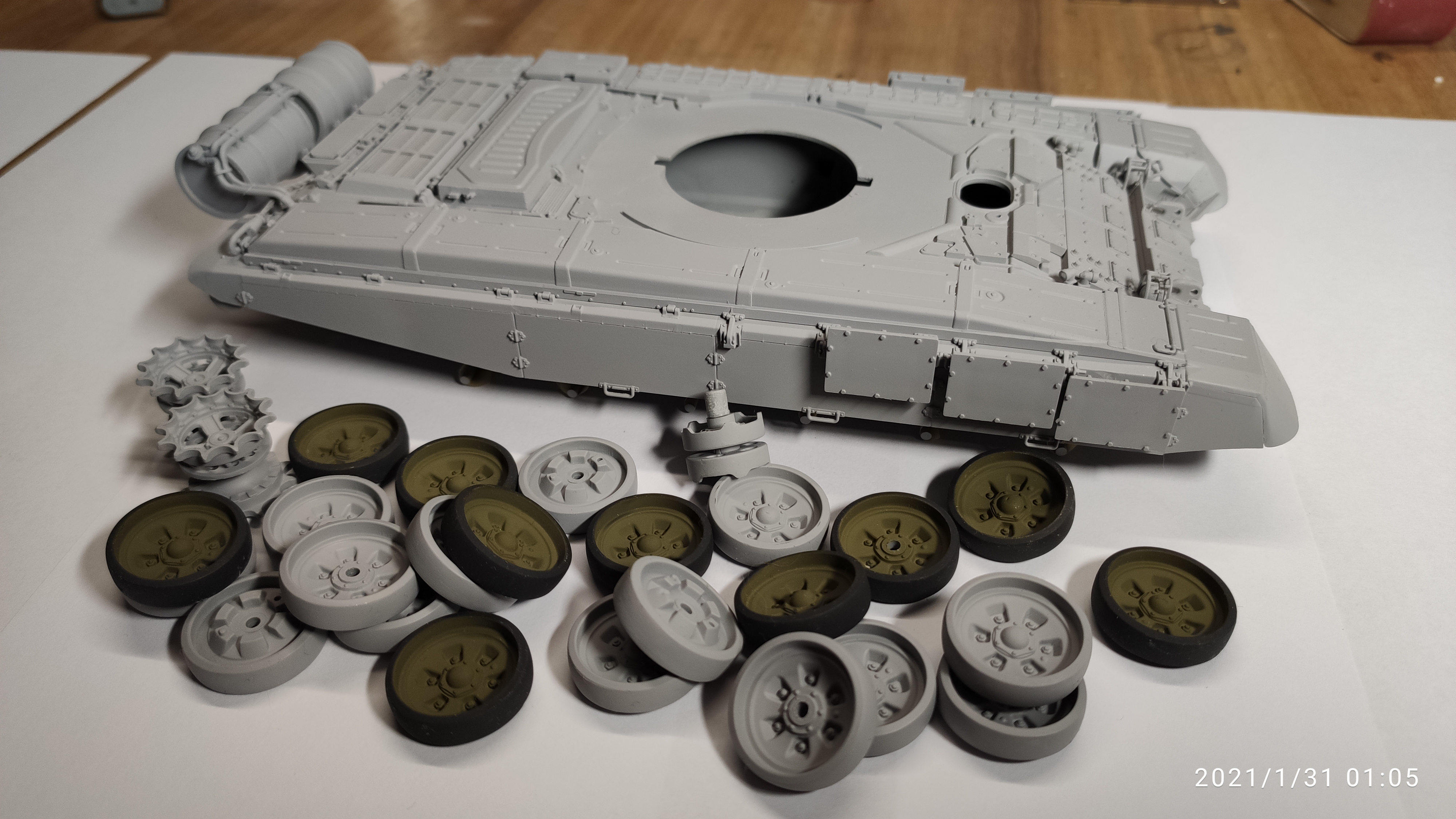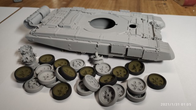 Башню запорол при сборке и выкинул, остался корпус, катки и литники с траками и другой мелочью.