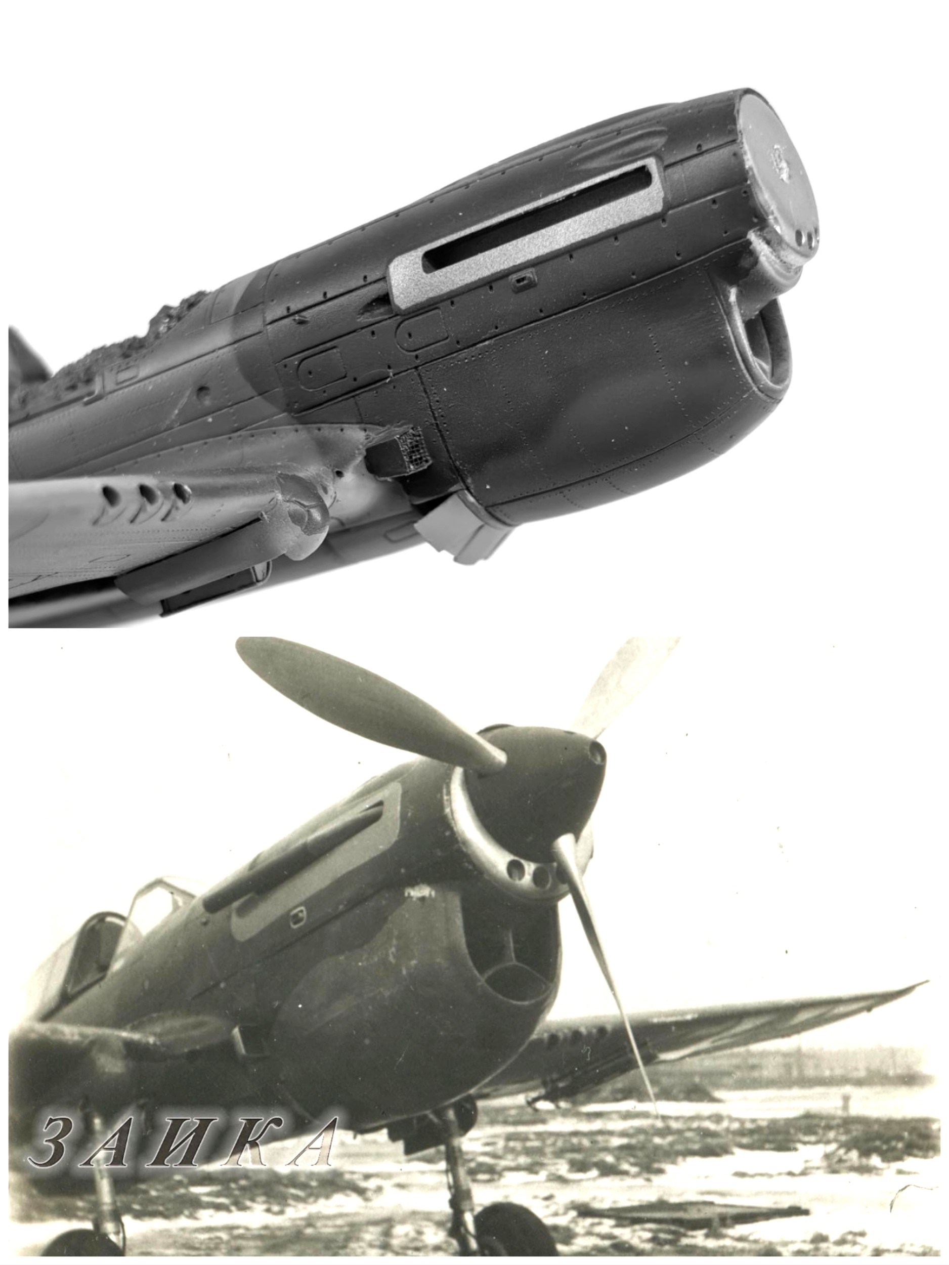 У Р-40Е с мотором М-105 на той самой единственной фотографии можно рассмотреть кучу интересностей. И которые не каждый моделист изображал на своей модели, почему-то. Во-первых, это явно видный дополнительный воздухозаборник в корне крыла. Что логично, ибо на ЛАГГах и Яках с таким же мотором этот воздухозаборник есть, и даже не один. Ну а судя по тому, что кок винта явно ЛаГГовский, значит и заборничков таких должно быть два)). Вот их я и сделал.