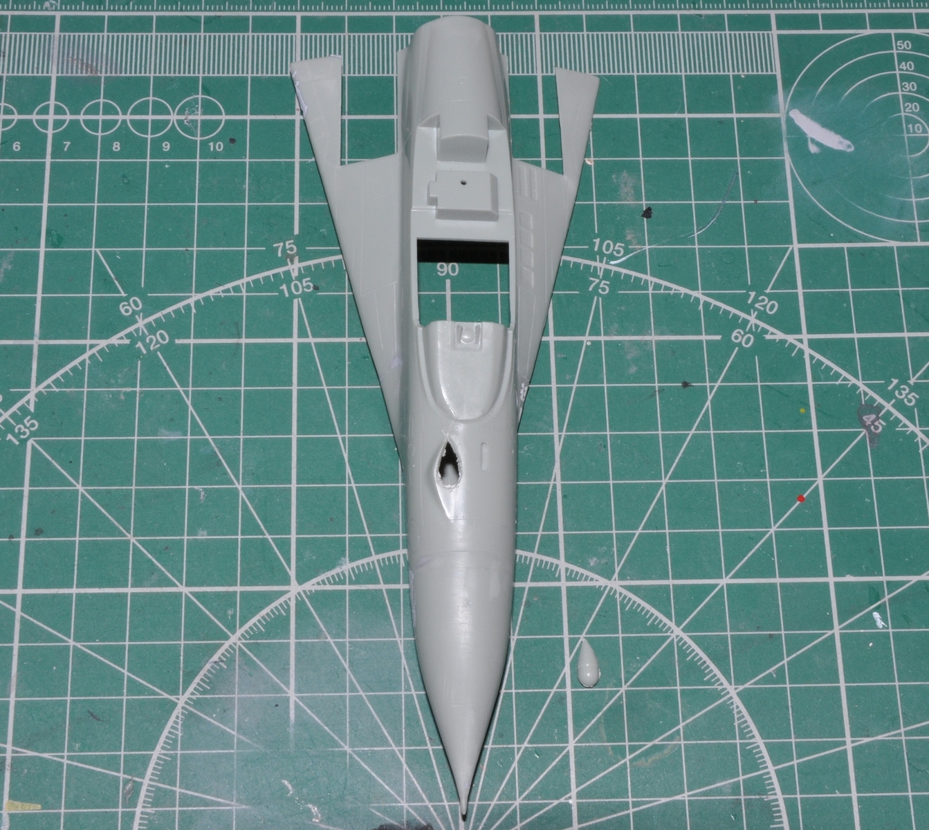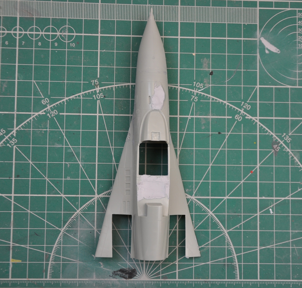 По совету АЛЕКСЕЯ я посмотрел его стройку, и понял, что проблема с нишами шасси не только у меня и собрал я ее не правильно, поскольку я соединил части фюзеляжа, распилил нишу и удлинил ее с помошью двухкомпонентной шпакли