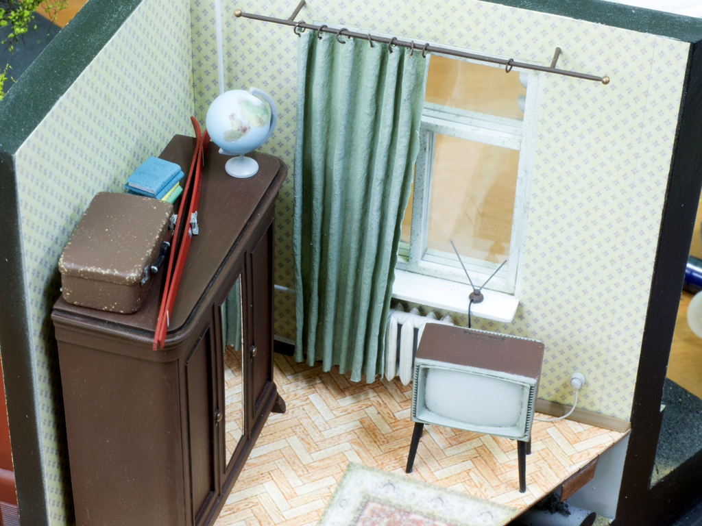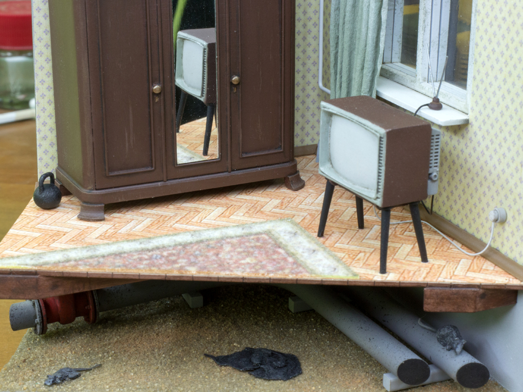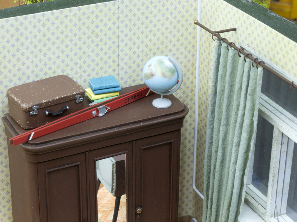 Сегодняшний пост целиком посвящен вашим советам. Поскольку моя супруга тоже обратила внимание на отсутствие пыли на шкафу, воплотил Юрин совет в жизнь. Смешав пигменты "Цемент" и "Европейскую пыль" получил нужный оттенок для бытовой пыли. Как предлагал Николай я сделал гирю, отличная маленькая деталь. Лишней не будет. Лично меня очень напрягали лыжи без палок. Добавил и их. Мой товарищ Слесарь Железнюк советовал закинуть что-нибудь в подвал, чтоб оживить пустое пространство. Я сделал тряпку, но как-то мне она не нравится на фото, хотя в жизни она выглядела вполне неплохо. Возможно ее заменю. В целом, кроме тряпки, наполнение комнаты окончено. По моему пора заканчивать строить дом в разделе "Автомобили".