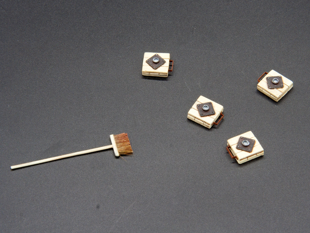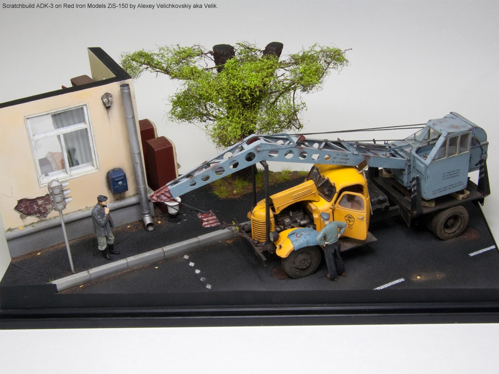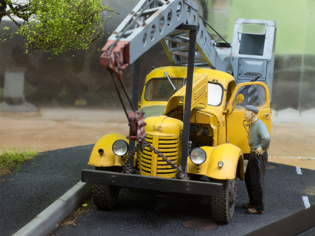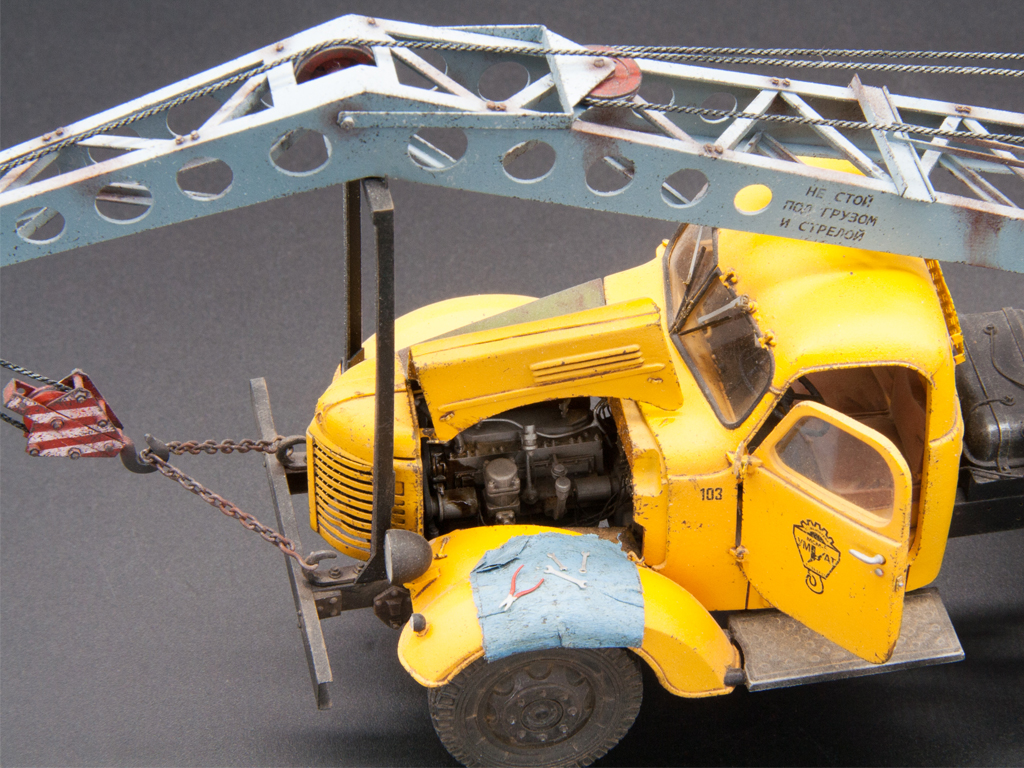 Для оживления машины использовал родные (от ZZ) площадки под аутригеры, правда заменил на них ручки. Сделал швабру. Воткну ее за кабиной, будет торчать как антенна)) Сделал тряпку на крыле и накидал на ней ключи. Остались гос. номера и все.