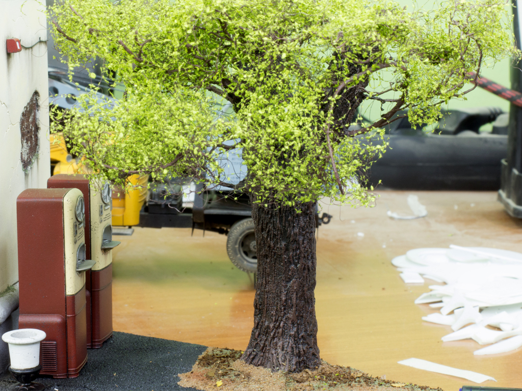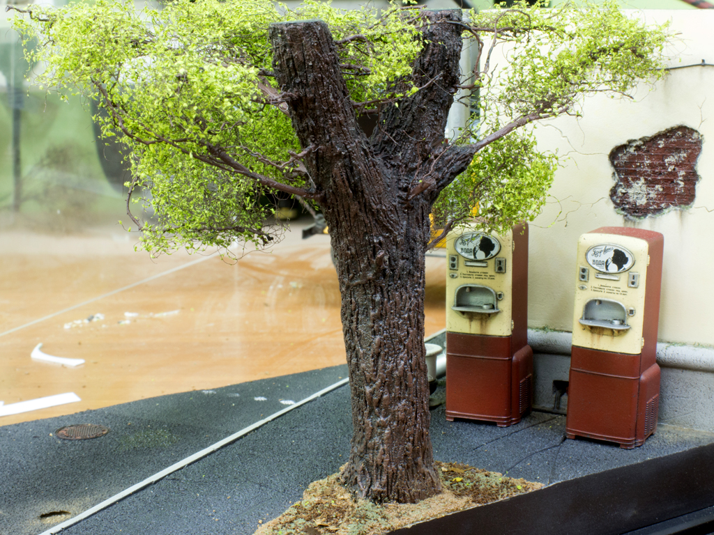 Закончил дерево. Сделал несколько фото с разных ракурсов. С задней стороны выглядит немного странно, т.к. диорама будет накрыта колпаком, и все что не влезает срезано. Но когда бокс закрыт смотрится нормально, глаз не режет. По крайней мере на мой вкус.