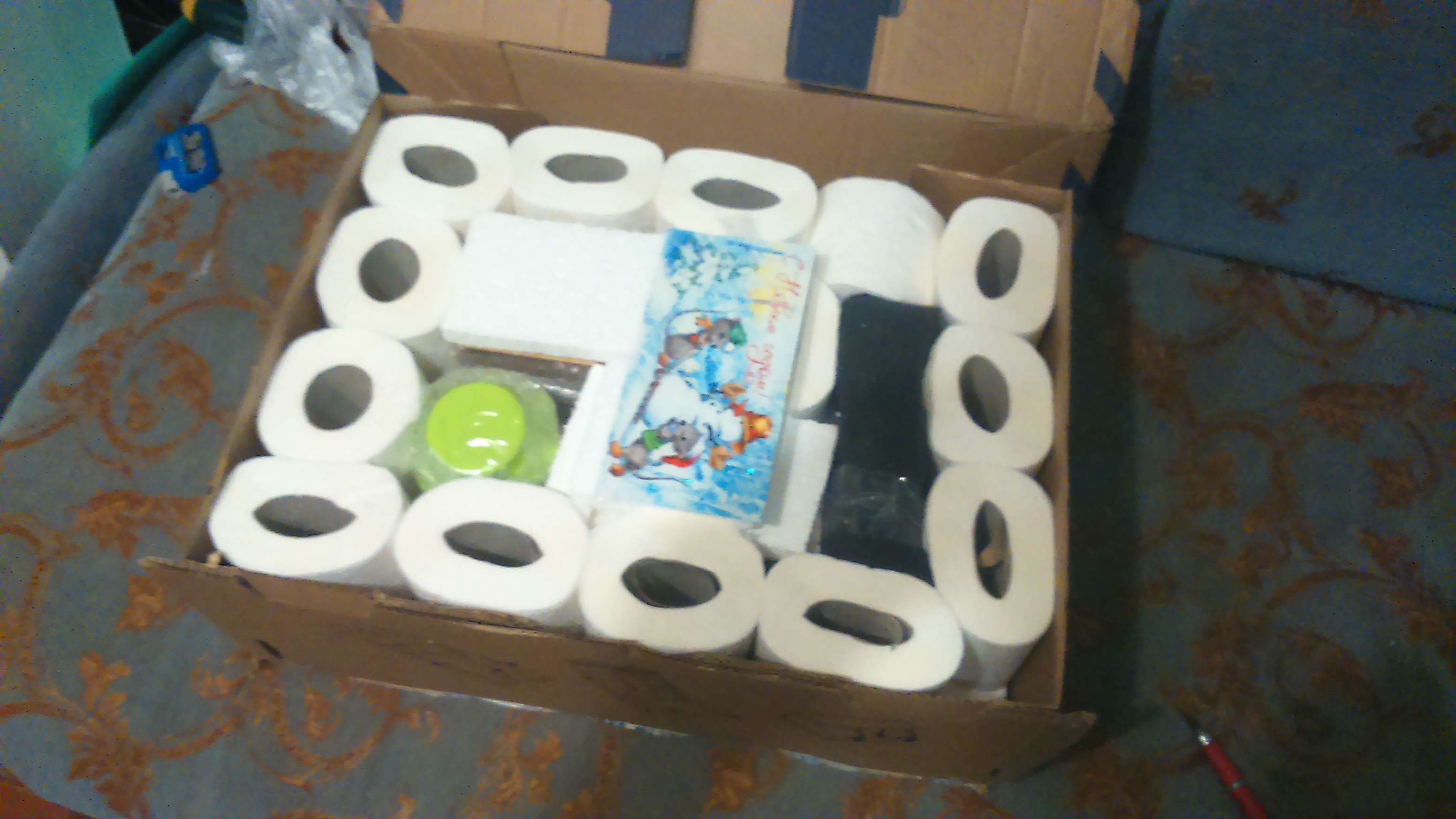 по приезду домой, пока нет любимой"ачотам" коробка была вскрыта...радости нет предела...Дедуля Александр Герасимов из Томска наполнил новогодний мешочек кучей всякой вкуснятины. тут и миод, и шЫшки(тут должна быть гифка с подозрительной совой) и орехи, и "сибирский бальзам",по вкусу очень напоминающий коньяк )))) и шкатулка для моей снегурки под ее женские цацки) и магнитики, и модель, которую я очень хотел.