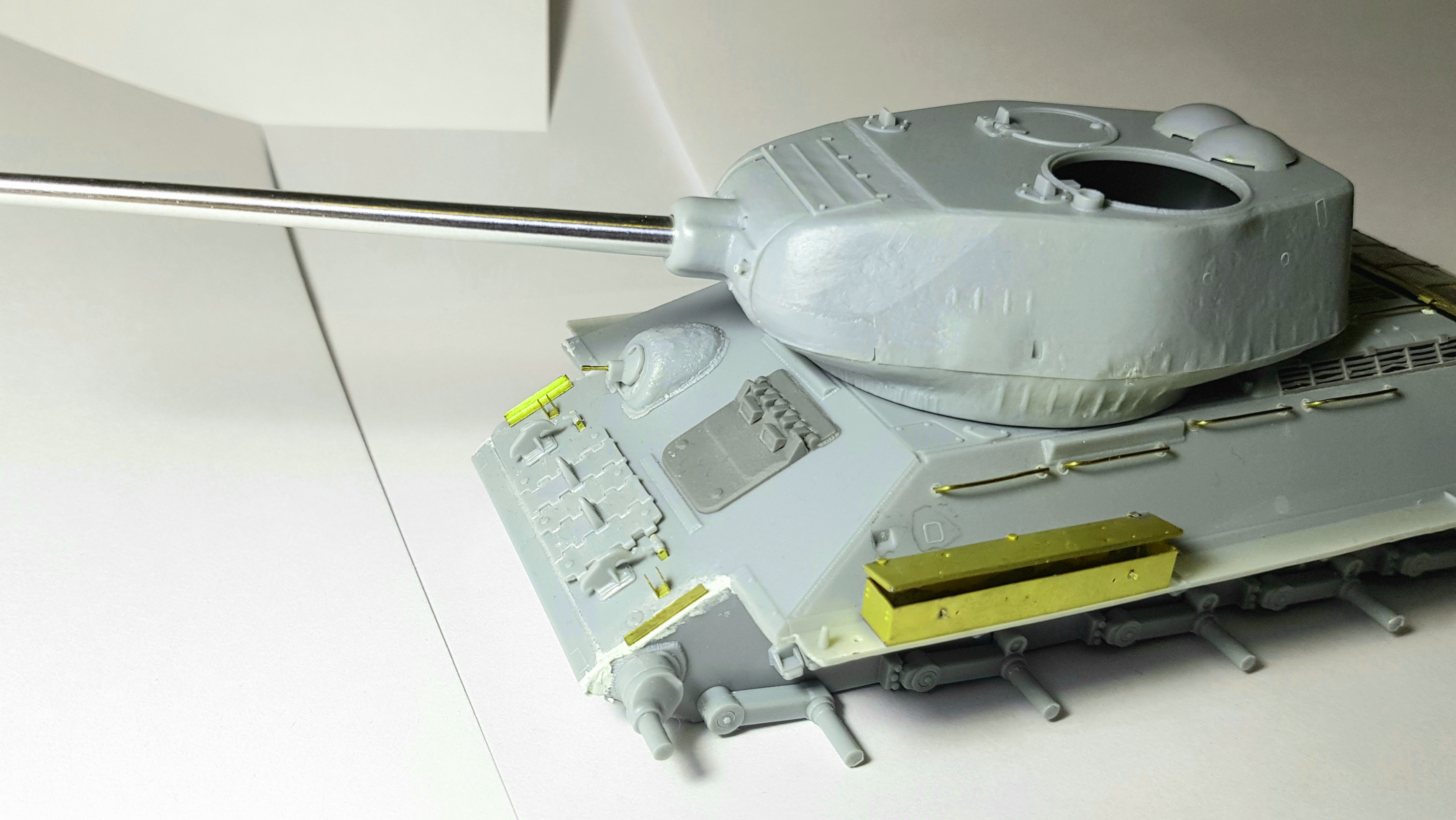 На текущий момент сделано следующее (видно на фото) сетка МТО и жалюзи (сразу скажу что сделаю петли аккуратнее, уберу лишнее), собран полностью 1 ящик ЗИП, второй почти готов, надо закончить (оба ящика планирую сделать открытыми и забрасать туда всякую мелочевку), люк мехвода и выхлопные трубы от "комплект ЗИП", пулемет курсовой заменен на метал, спареный на текущий момент просто расверлен, возможно тоже заменю, надгусеничные полки сточены (менять не планирую), на левом борту танка(по ходу машины) заменены на проволоку поручни, к ним еще планируется добавить имитацию сварки, из шпаклевки, крылья срезаны. Конкретную привязку к прототипу делать не буду, просто хочу собрать модель и поставить на полку, на небольшой подставке.