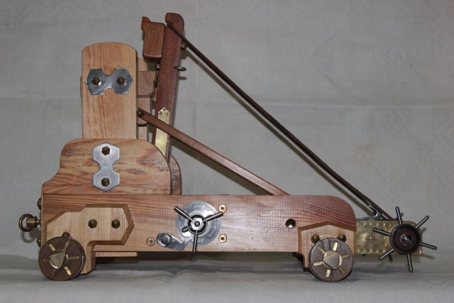 2-Человек уменьшенный до масштаба вашей катапульты будет не в состоянии привести её в рабочее состояние, так как у него просто не хватит рычага. У вас короткие рычаги натяжения. Так как рычаг нужной длинны не создать, римские инженеры придумали пазы в которые и вставлялся длинный рычаг с одной и другой стороны.