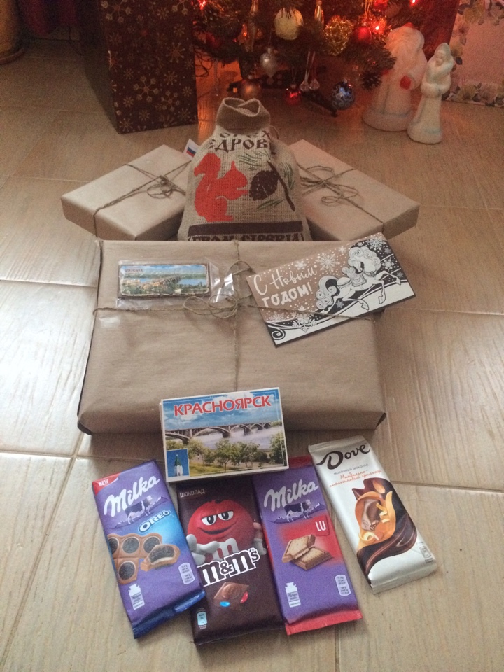 Помимо модельного содержимого в коробочке лежал волшебный мешочек с кедровыми орешками, шишками и вареньем, шоколад, магнит и набор открыток с видами Красноярска, ну и конечно открытка с теплыми пожеланиями!