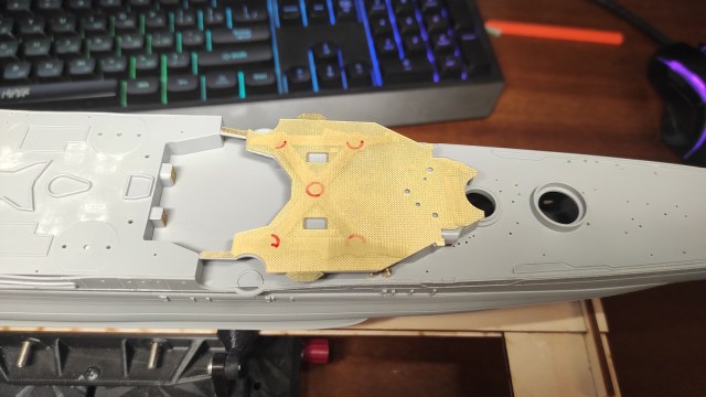 Там всё чуть сложнее, я может потом попробую фото сделать. В одном месте латунная палуба чуть меньше, в других больше (сточить не проблема). Есть ещё посадочные места под палубную мелочь - они чуть уедут, получается. И рельсы - если ставить латунную - надо рельсы от Flyhawk. Я пока не сравнивал, какие рельсы красивее.