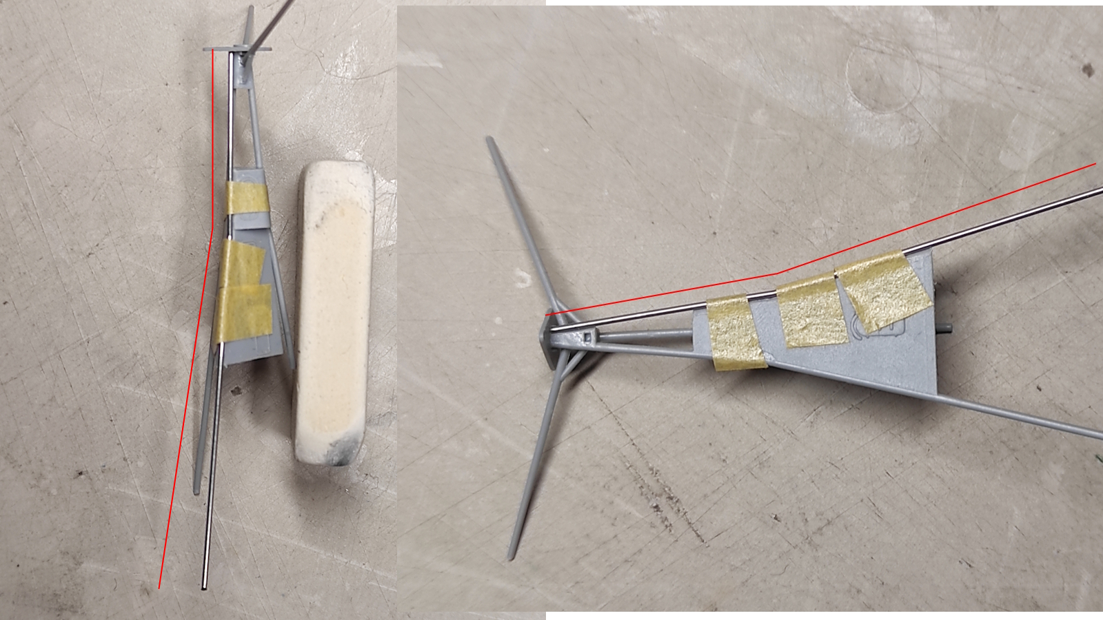 Задние ноги мачты изогнуты как бы в двух плоскостях - если смотреть сбоку и сзади/спереди. Угол изгиба получилось подобрать достаточно точно, а вот выставить так, чтобы плоскость ноги из иглы совпадала с плоскостью пластмассовой ноги (которую удалил) — пока трудно, только на глаз. Плоскость — если верху смотреть. Я, наверно, криво объяснил ))