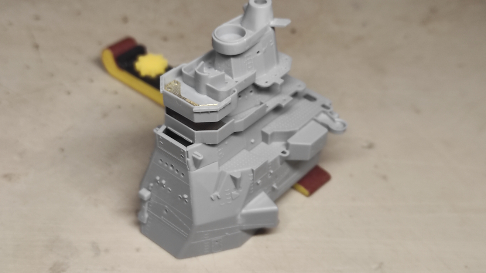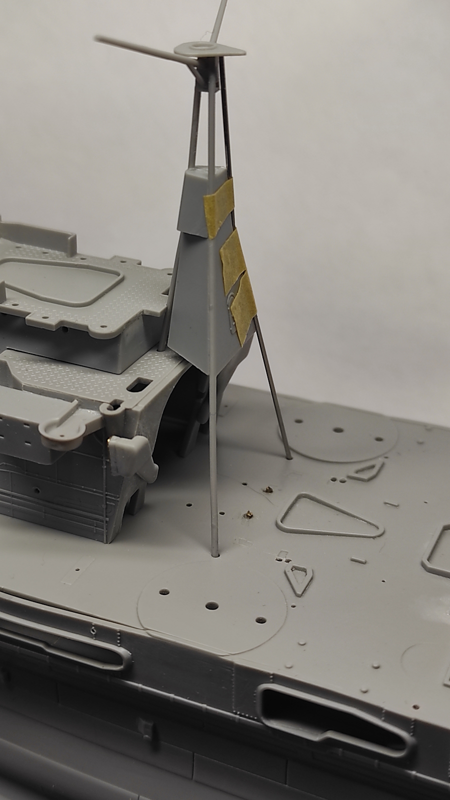 Занимаюсь примеркой палубных деталей до покраски. Главная надстройка и труба примерены, теперь передняя мачта — фок-мачта?