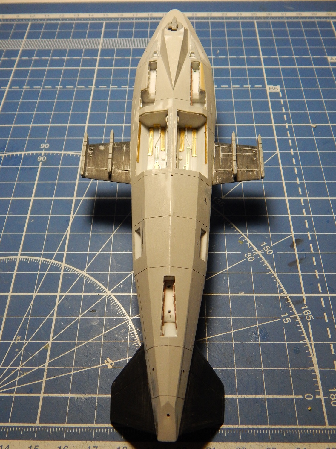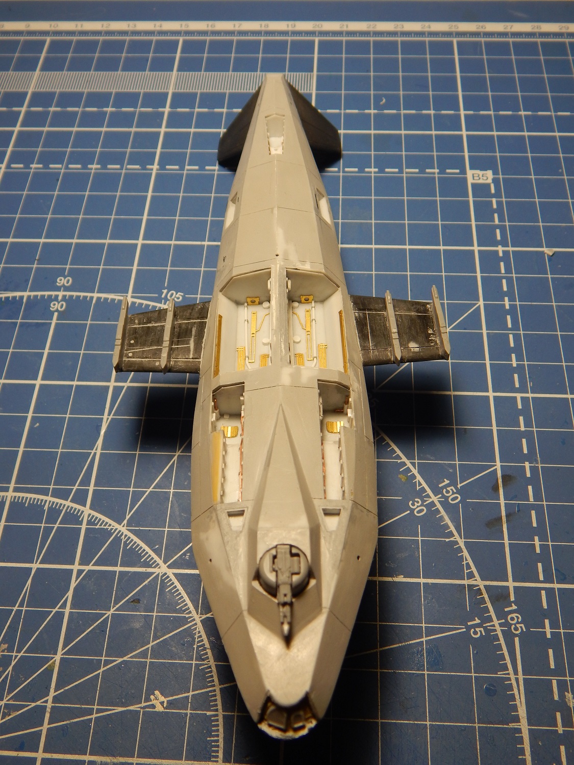 В принципе закончил основные работы по фюзеляжу, доработал ниши шасси и ракетного отсека, изготовил новые выдвижные пилоны в ракетный отсек (те что чисто черные - это то что дается в наборе) , изготовил и установил ниши под блоки ЛТЦ АСО-2В, изготовил и установил ниши под фары, изготовил в носовой части оптико-электронную систему (потом она будет закрыта прозрачным обтекателем), изготовил и установил новые пилоны на крылья (те что в наборе ну просто издевательство над моделью).