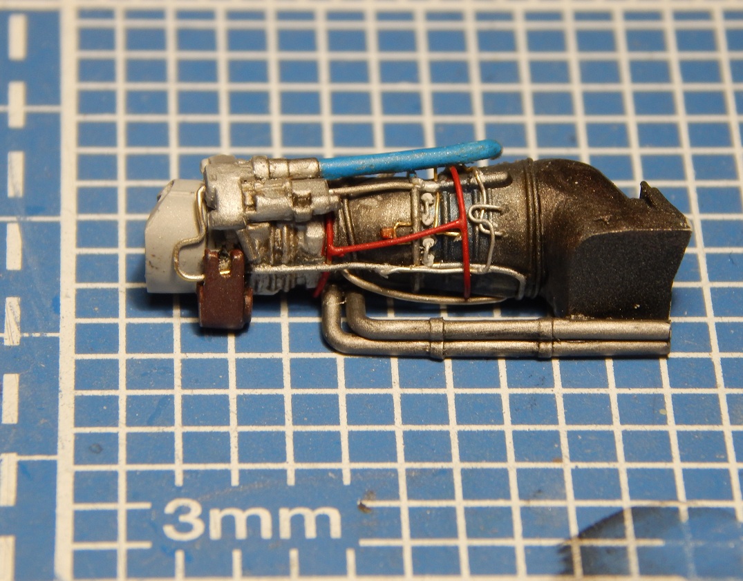 Закончил делать для одного из Ка-58 - двигатель. За основу взял смоляную копию двигателя ТВ3-117 от "Звезды". Правда пришлось его чуть-чуть изменить в силу того что: 1 - копия из смолы получилось не идеального качества и по центру двигателя был шов, который прикрыл шлангом; 2 - выхлопная система у вертолета находиться сзади, а не как обычно - сбоку. Но я старался максимально оставить двигатель без изменений и как можно точнее.