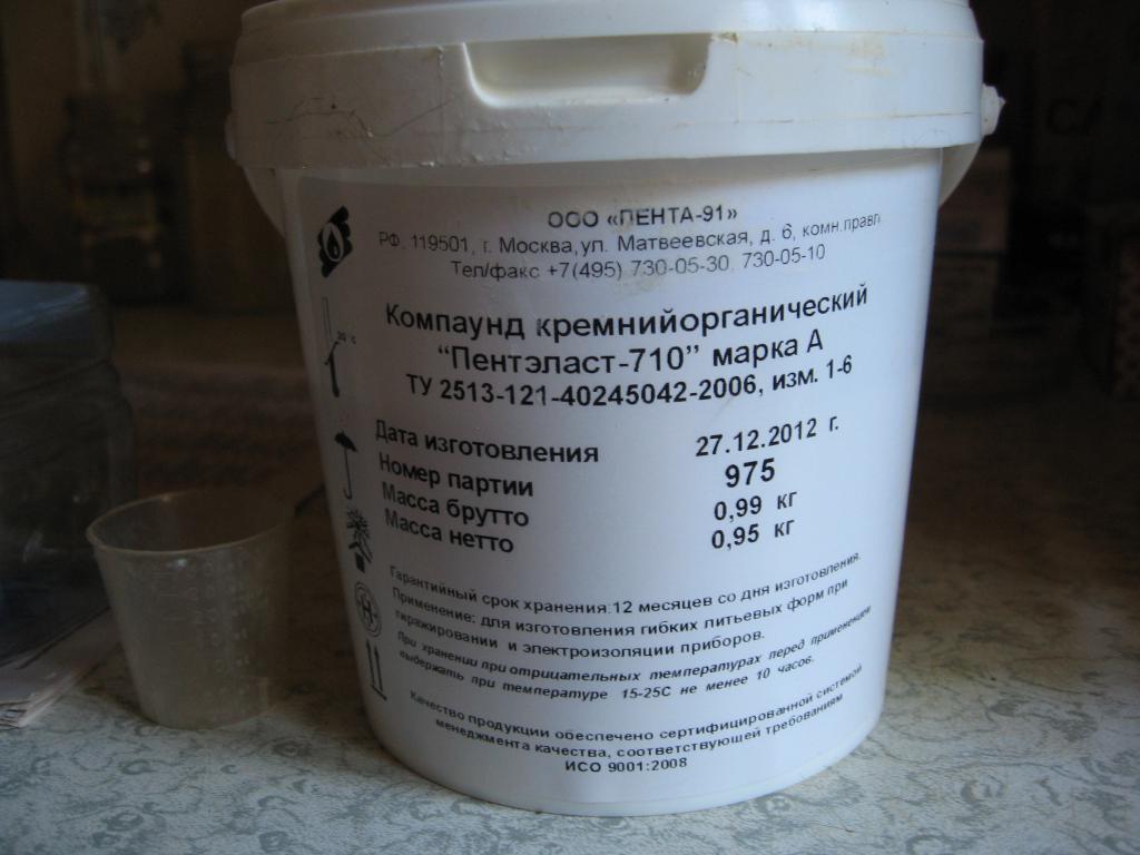 Есть специальная разделительная смазка для силиконовых форм. Она выпускается в аэрозольных баллонах. Стоит недорого. Но это нужно, наверное, тем, кто постоянно связан с отливкой в силиконе. Я одно время отливал солдатиков в силиконовые формы. Формы делал из материала под названием "Пентэласт". Покупал в какой-то фирме на окраине Москвы. Там же купил и аэрозольный разделитель. Разделителя, думаю, даже при самом интенсивном использовании, хватит на 100 лет. Слышал, что ещё натирают деталь тальком, чтоб не прилипала, но он потом при отливании может дать ненужную шероховатость. На всякий случай, вкратце опишу, что нужно для отливания из пентэласта. Вот собственно, сама фотография ёмкости, в которой продаётся этот герметик. С ним ещё вместе в комплекте идёт катализатор в пузырьке. Разводится, как эпоксидка: нужное количество компаунда смешивается с нужным количеством катализатора. Отливал из сплава Розе, смешанного с припоем в пропорции один к одному. Пентэластом копировал солдатика, и потом отливал из сплава. Результат понятен. Если нужно очень подробно рассказать, как я это делал - без проблем, поделюсь всем, что умею.