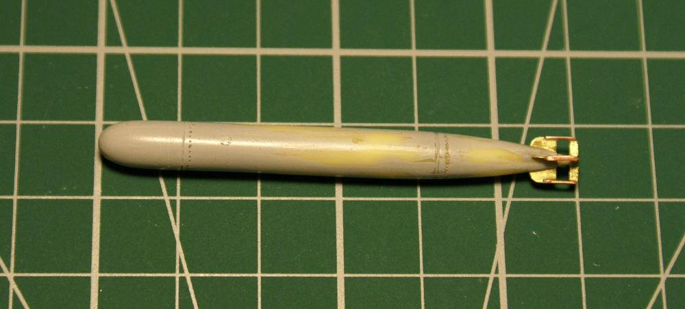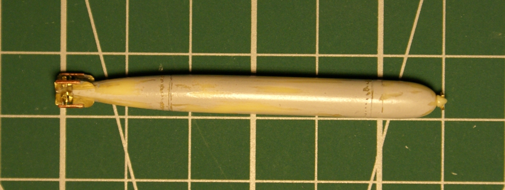 Доделал винты на второй, грунт, чистка всех косяков, повторный грунт, и наконец окраска! Основной цвет - тамиевский серый металлик, взрыватели и винты - золото, передняя часть торпеды смешал на глаз "под медь". Увы, качественная макросъемка не получилась, никак не могу подружиться с этой функцией фотоаппарата
