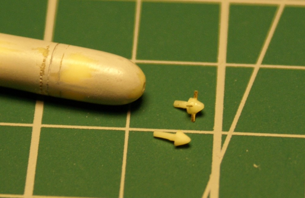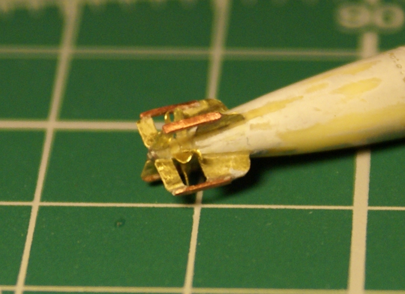Решил оставить взрыватели с крыльчаткой, доделал первую торпеду - приклеил лопасти из той же листовой латуни. На фото взрыватель сидит неплотно, приклею его после установки торпеды в ложементы