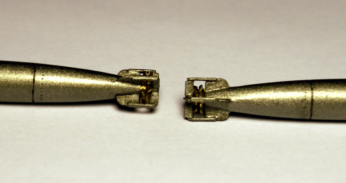 При работе с оперением торпед первоначально хотел клеить металлические детали встык, но после первого элемента, который отваливался от малейшего касания, изменил технологию: бор-машинкой с отрезным диском толщиной 0,2 мм проточил направляющие под стабилизаторы и вставил элементы из листовой латуни - крепление оказалось намного надежнее!