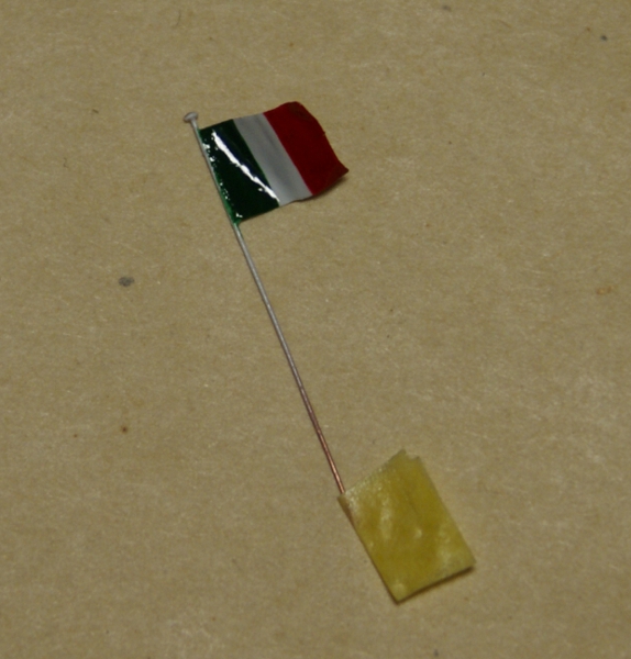 Сделал свинцовую фольгу из дробинки, вырезал прямоугольник примерно 5х7 мм, слегка помял его и за несколько вечеров мучений кистью все-таки удалось изобразить итальянский флаг.