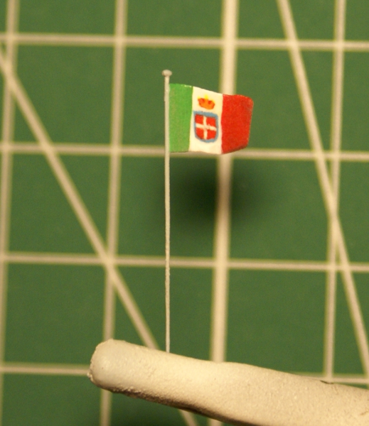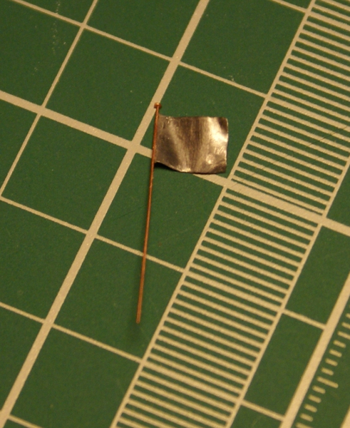 Михаил, я думал над таким вариантом, но честно говоря, у меня никогда раньше не получалось правдоподобно изогнуть декальный флаг. Так что решил опробовать технологию флага из свинцовой фольги, изгибы вроде удачно получилось на мой взгляд. А тот факт, что на макросъемке нарисованный флаг не так уж и идеально выглядит - это не беда, в реале он совсем небольшой. Для наглядности размеров скажу, что сам флагшток имеет диаметр 0,35 мм (уже с краской)