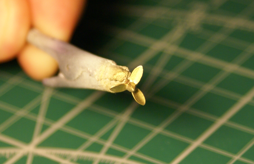 Доделал винт, использовав центральную часть из смолы и дополнив ее лопастями из латунного листа. Попробовал дополнить взрыватель крыльчаткой, но оказалось, что у меня просто физически не получается удержать деталь меньше 0,7 мм в длину пинцетом