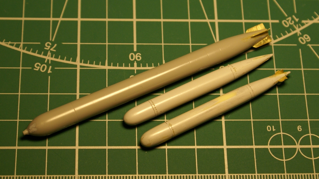 Стабилизаторы торпед оказались тем еще геморроем, сделал пока только одну торпеду для пробы технологии. Главное, чтобы эта мелочь пережила грунтовку и окраску.